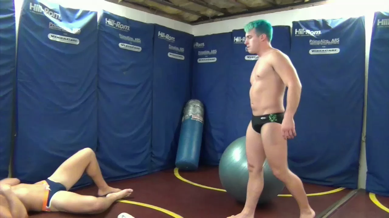 Barefoot Oliver and booted Chastain get it on, with Chastain demanding a showing of fealty from his proposed victim. On hands and knees with Chastain's thighs gripped around his head, Oliver is informed that this moment in time will end only when Oliver kissed Chastain's fuckin' feet. Oliver has to win, or those feet will be in his face for sure.