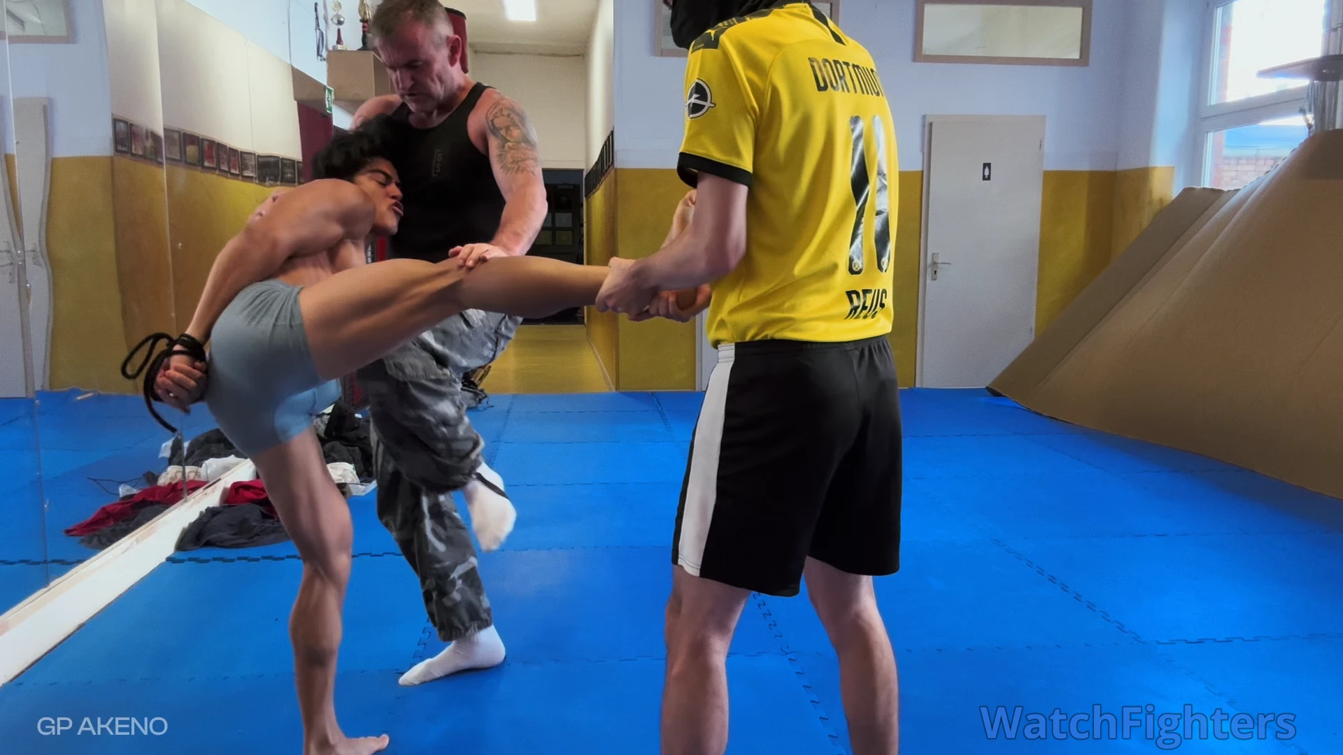 Throughout the åssault they take turns with gut punches, kicks, knee attacks, trampling/stomping. There is also some grappling and a human tug of war PLUS throwing me like a ball from one attacker to the other as they take turns to punish my abs.