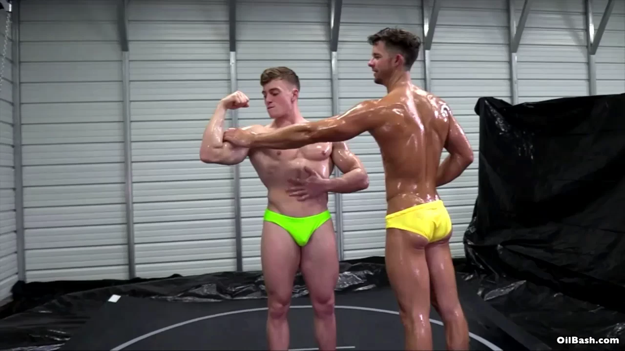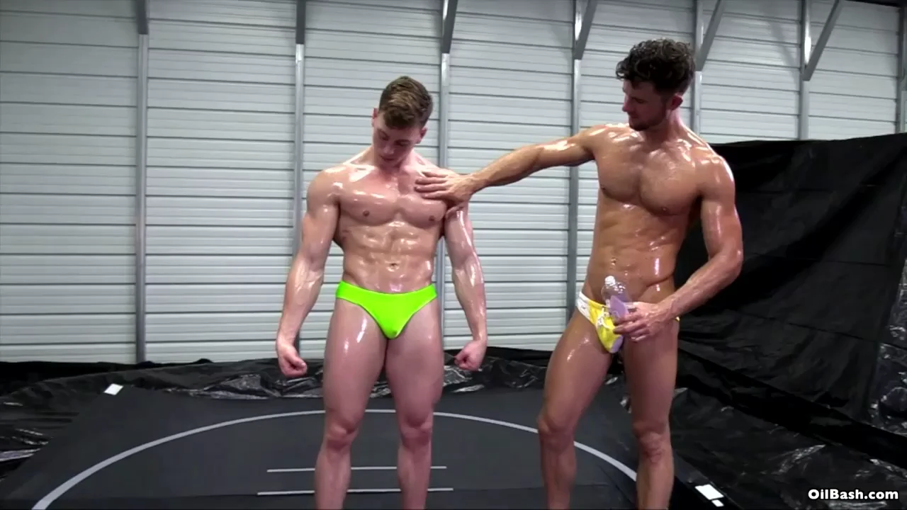 Blake Starr is really looking sexy in his yellow and white trunks and much stronger body. Scrappy is simply stunning in his neon green trunks. These two studs have enough testosterone for 10 men. Blake has a couple of inches – in height – on Scrappy, but Scrappy has more muscle. Both men love to trash-talk and both have enormous egos. These muscle men raise the heat when they start oiling each other before the match. There is a high level of sensuality when Scrappy soaks Blake’s solid body in oil. The level of sensuality goes up even higher when Blake oils the rippling muscles on Scrappy. Anything can happen in an oil match, but one thing is for certain, this match will be incredibly sexy.