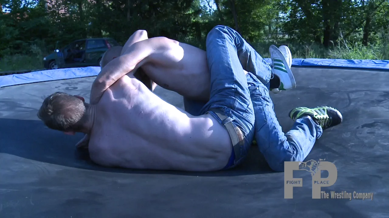 Soon, the heat of the afternoon is matched by the intensity of their fight. After a few rounds, they ditch their jeans and continue in speedos. Igor soon realizes the fight is tougher than expected. His tricks are decent, but his lack of stamina gives Toni the upper hand.