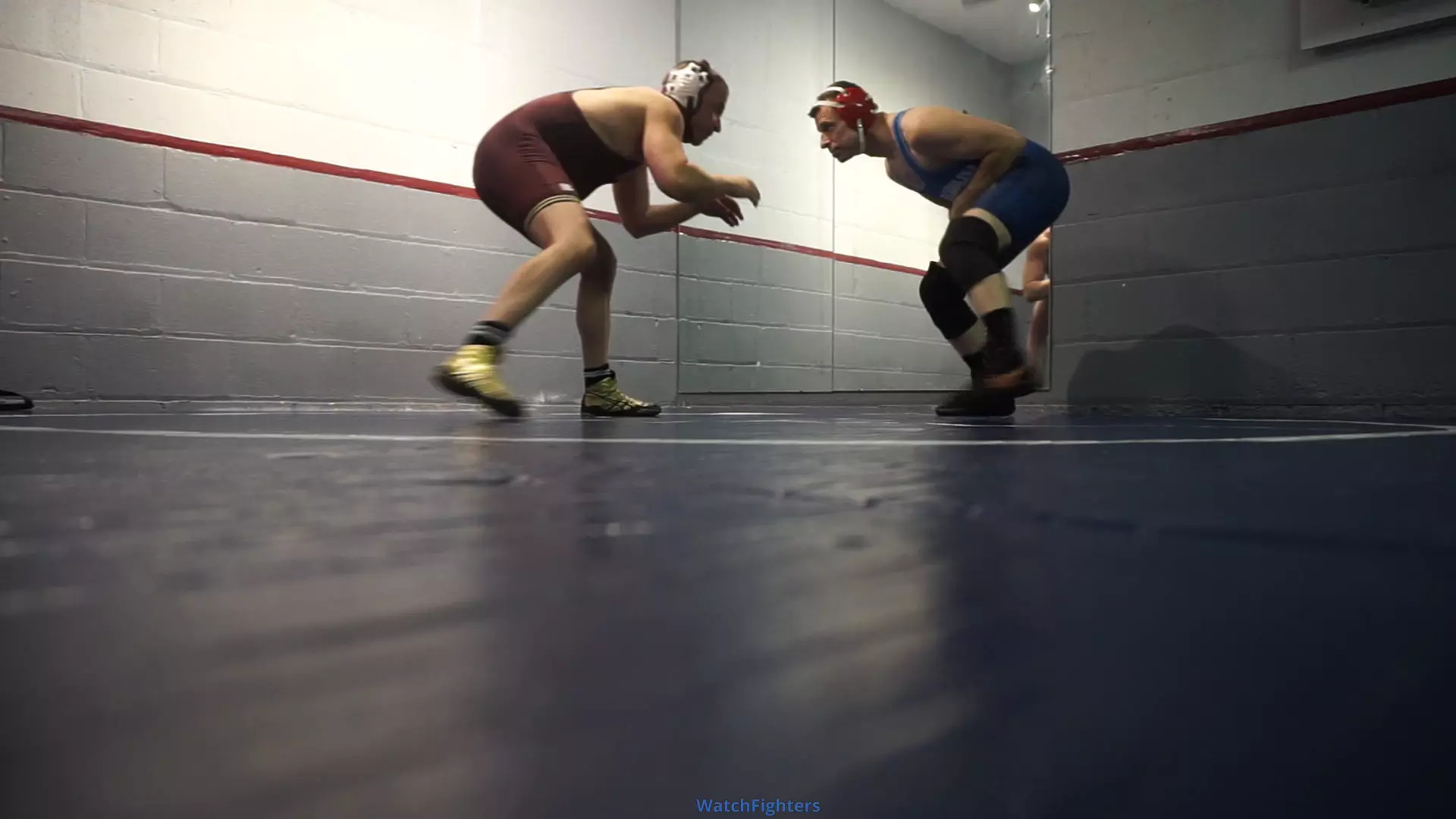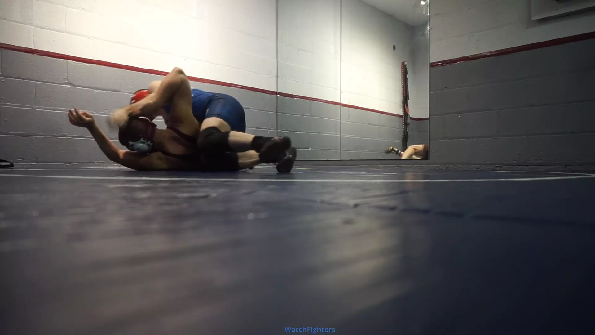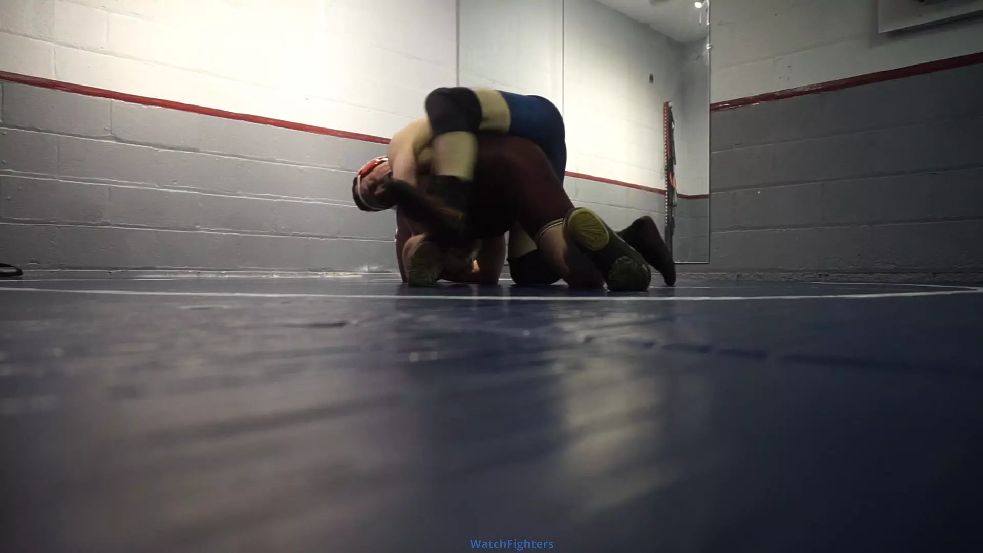 Daddy and JS wrestle it out on the mat in singlets and headgear. Cam is at mat level.