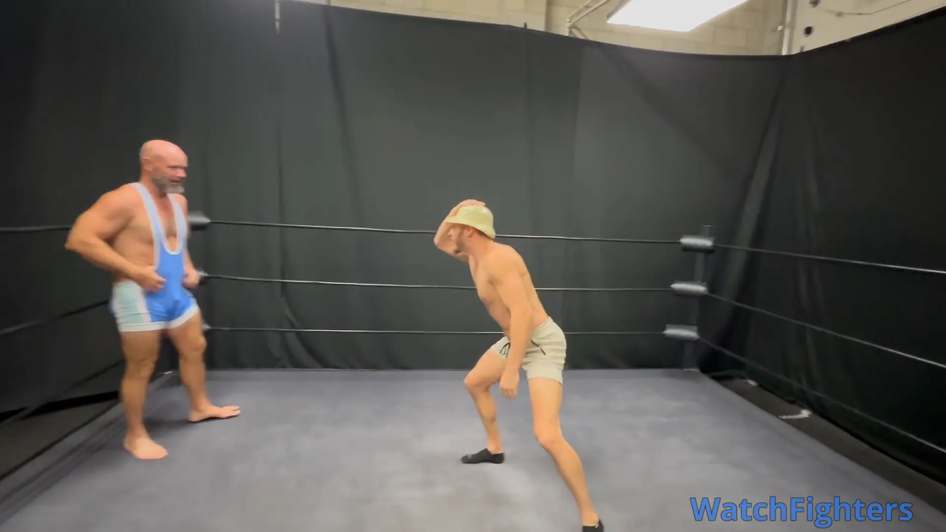 Safari hunter Dick has found a bear loose in the wild! That's not really the right kind of bear, but he doesn't realize that. This match features (bear) claws, submissions, abdominal stretch, bear hug, body scissors, full nelson and finally, fitting a grown bear into a little transport bag.
