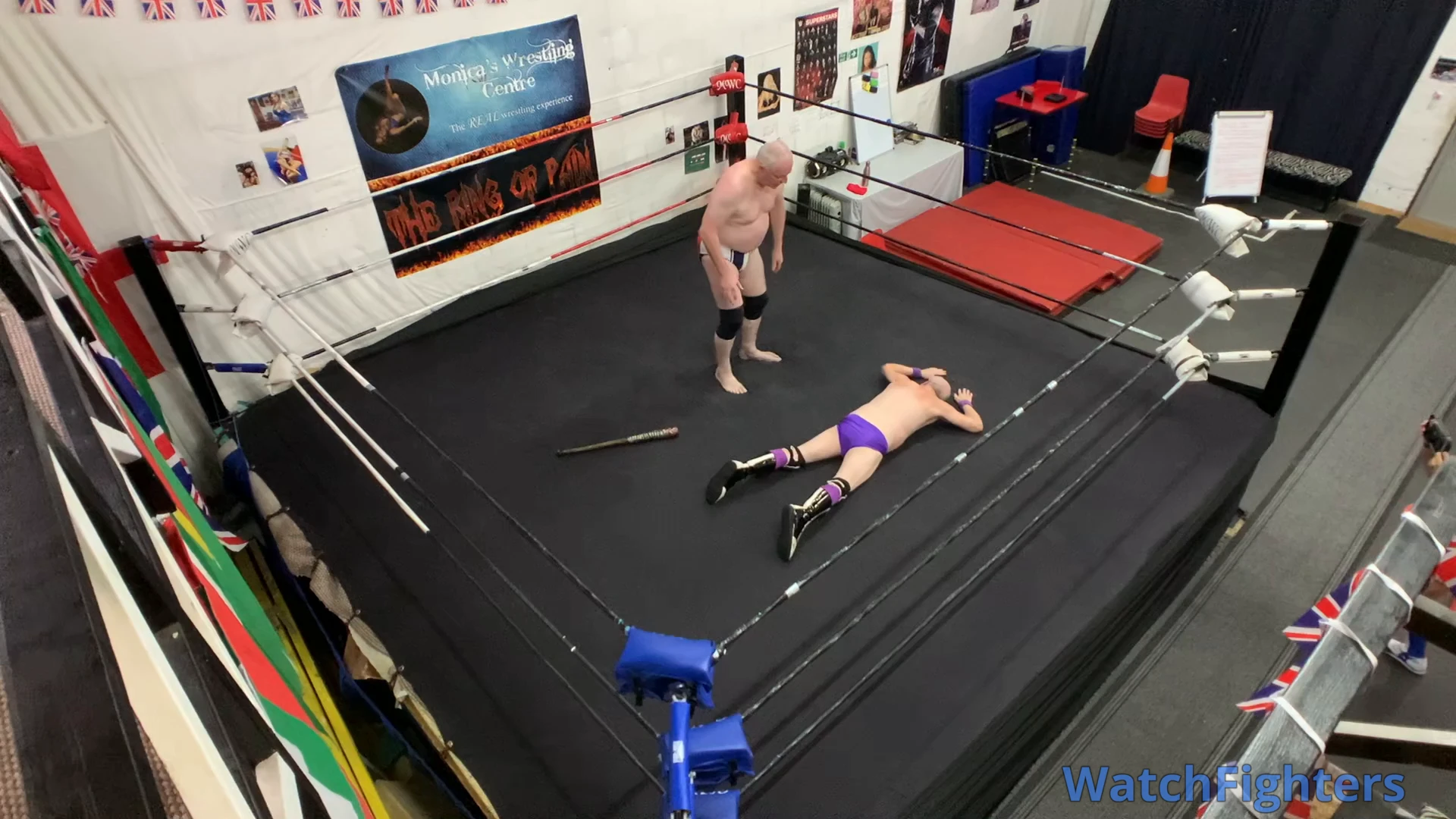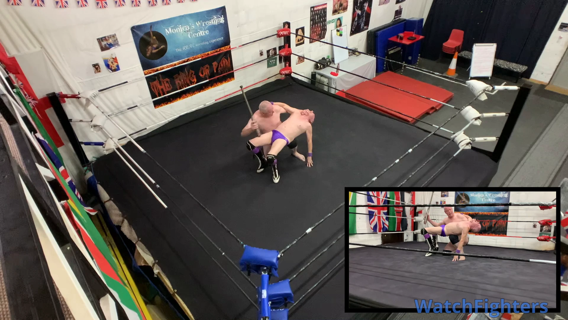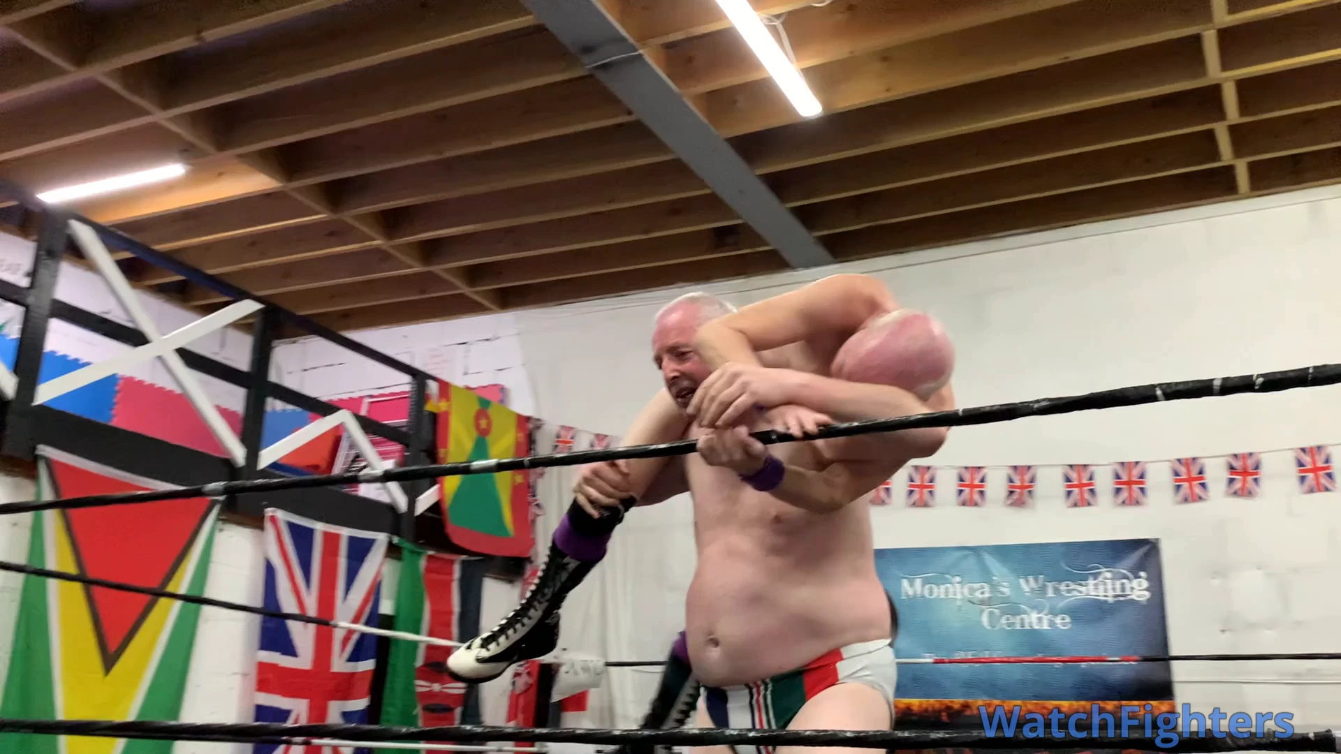 Action from a pro style wrestling match featuring Roger Ripper v Stephen held at MWC London.