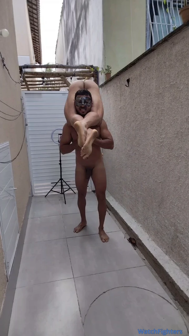 Saltando alto e aplicando tesouras corporais no corpo do meu oponente forte