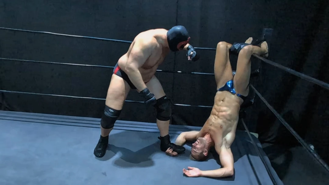 Pounding on his package, Bison taunts the lean rookie and stomps on his flailing hands. Stuck in the corner, Stone is unable to stop the barrage to his balls. Just as the blood rushing to his head gets to be too much to bear, Bison flips him back down the mat.