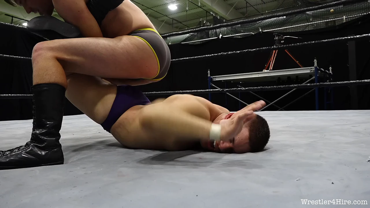 Andrews helps by plowing his black boot deep into the big boy’s abs, hurling him into the ropes, twisting his legs into impossibly painful positions. At this point, Vinny’s gotten good at expressing his pain. No more tough guy pretending to take the pain with dignity. Now he taps, begs, pleads, and cries...and we’re only one minute into this punishment parade!