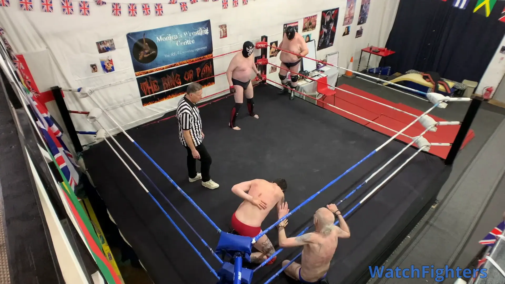 Action from a pro style wrestling tag team match featuring the team of Lord Tyrant & Ghoul v Matthew & Ady held at MWC London.
