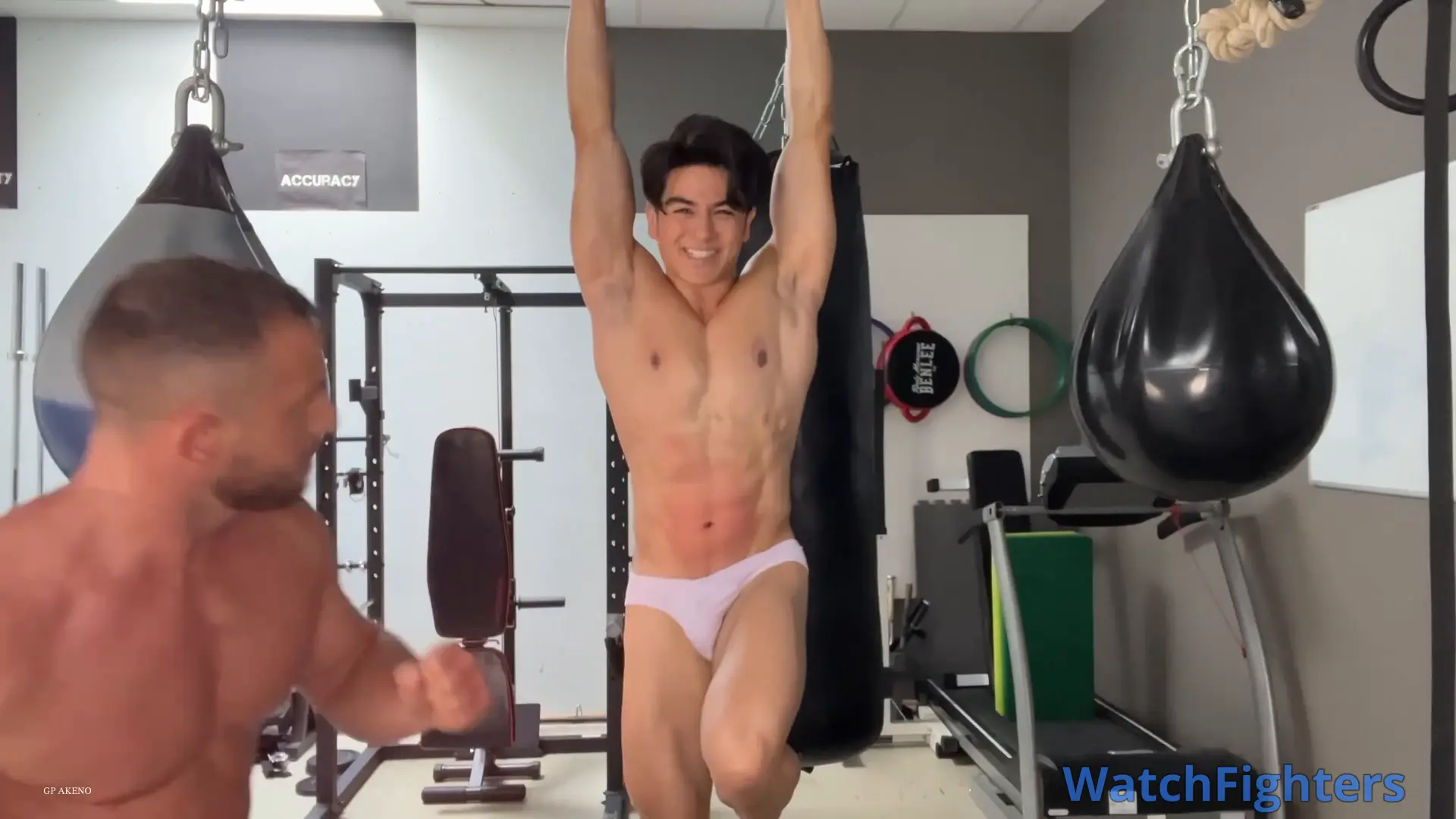 More gutpunching and elbow strikes for both of us in a hanging and stretched position and also on my part with my knees raised. Then some navel play and concluding with Alex unloading his juice on my pecs 😏