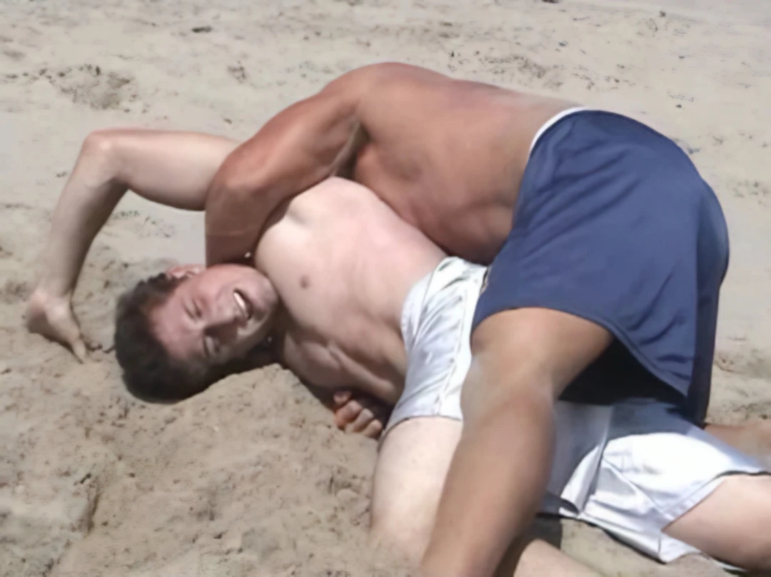 Benny (in blue) and Brian (in silver) square off in this wrestling match that takes place on a beach. Both appear to be almost of equal height and weight, with good looking bodies. You will see chokes, dragon sleepers, full nelsons, arm bars, Boston crabs, leg locks, camel clutches,