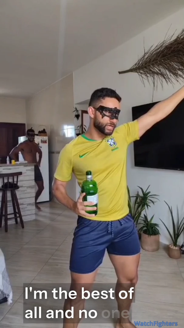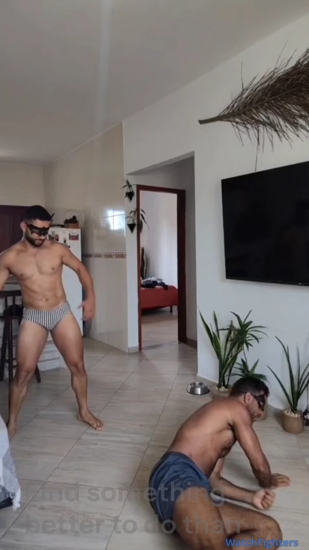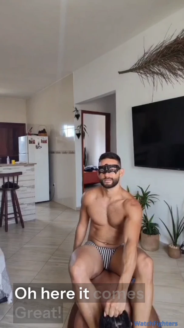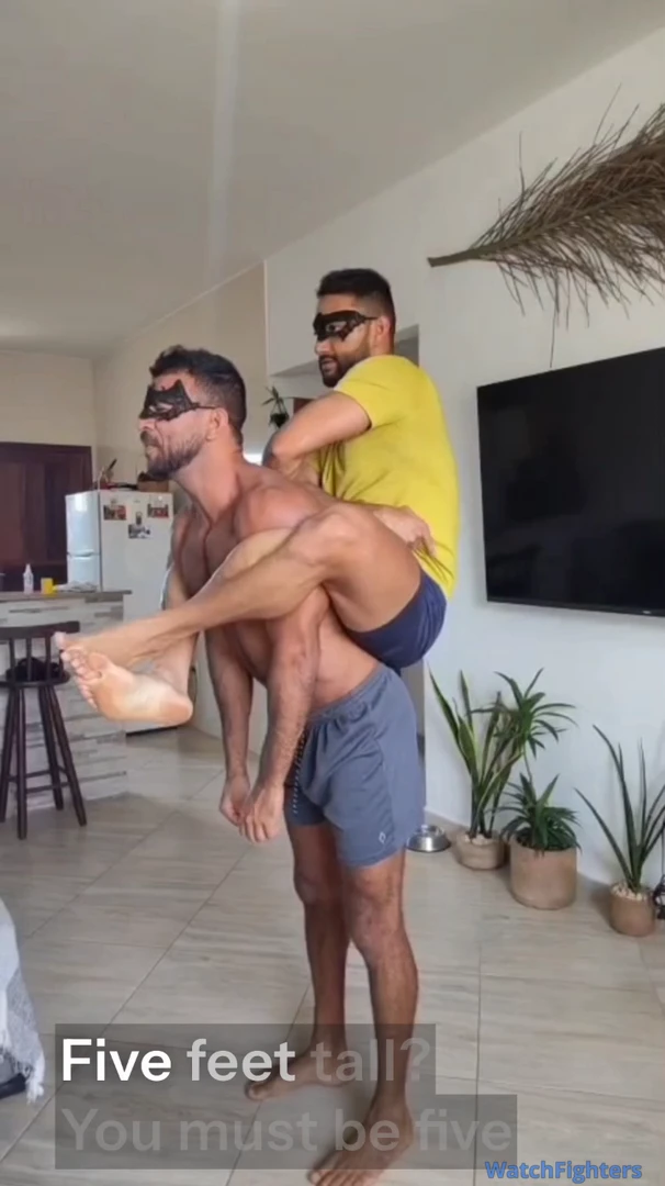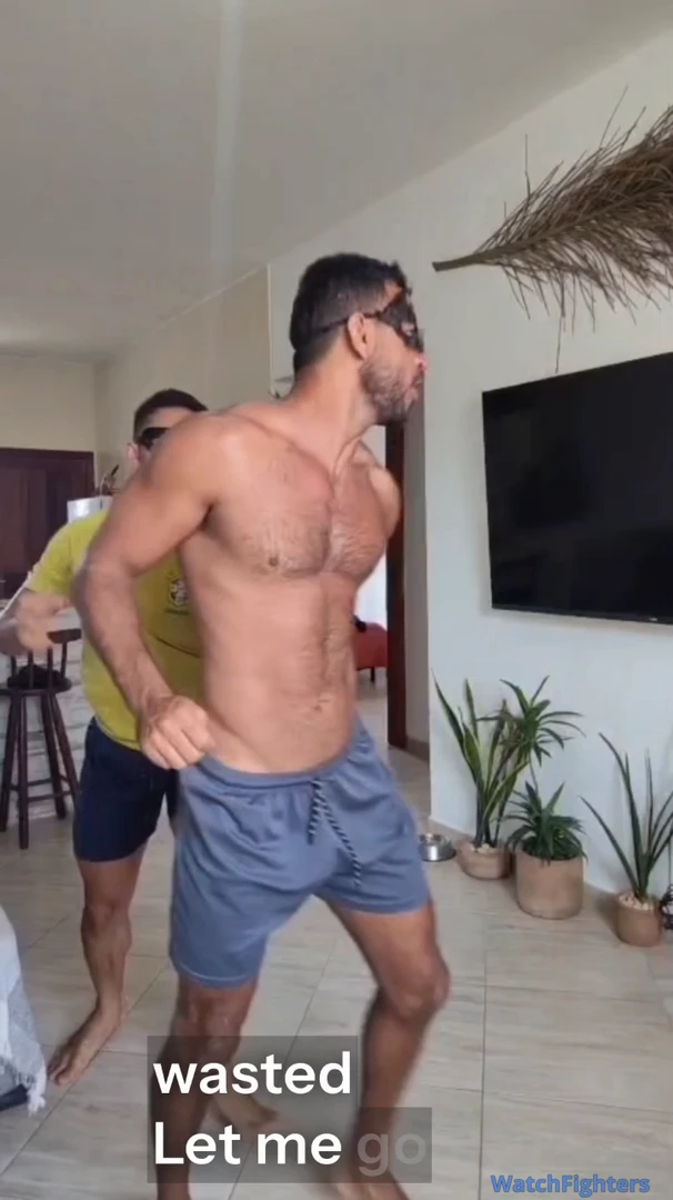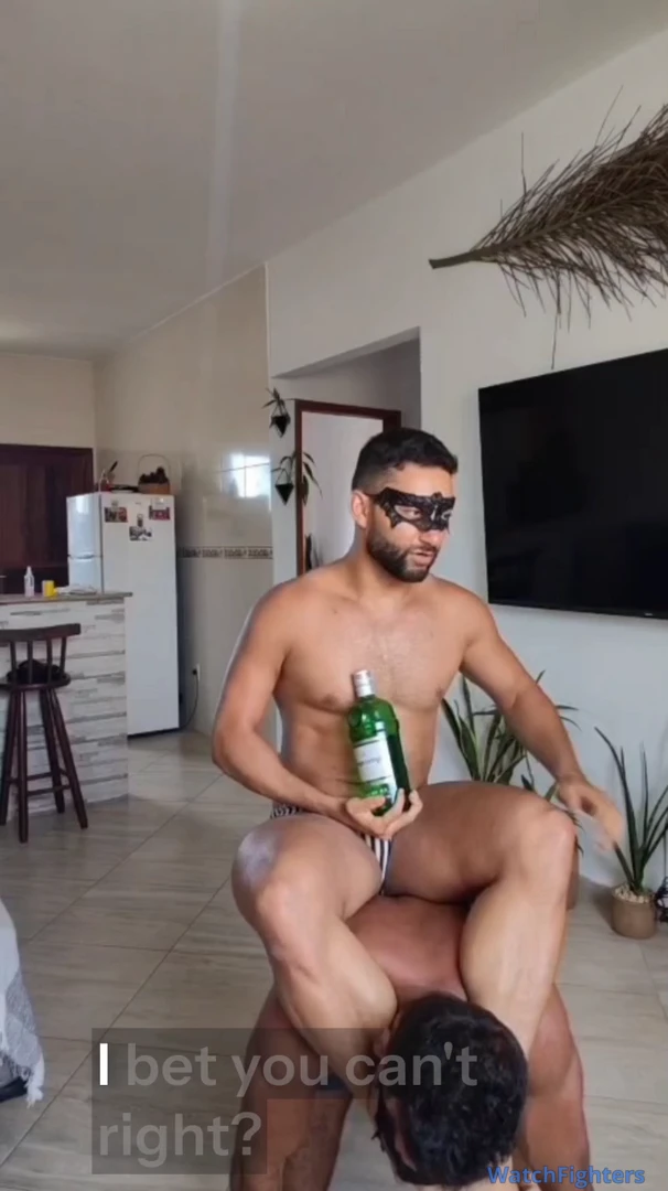 Jogador de futebol bêbado aplicando tesouras corporais no cara alto marrento até esmagar sua barriga