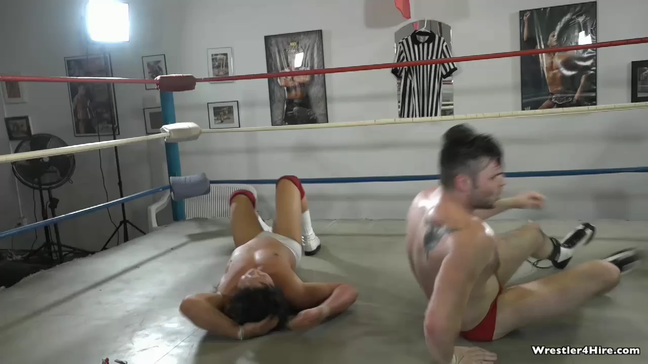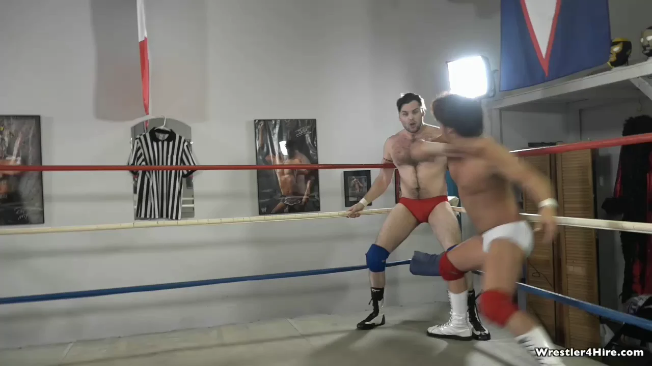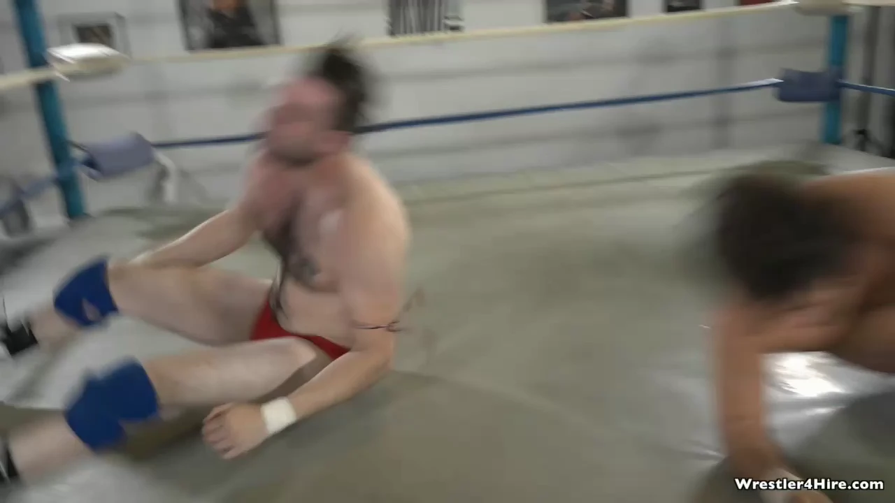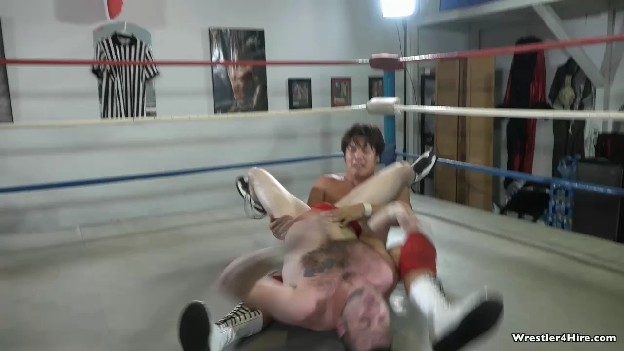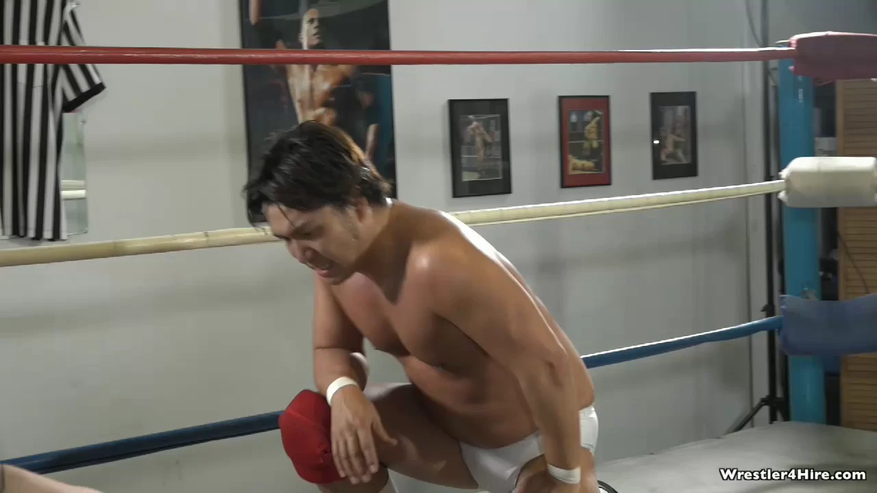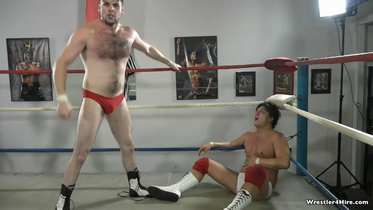 Hairy, geeky camp counselor-type Todd bounds into his battle with sexy Leo Sasuke like he knows exactly what he’s doing. Leo doesn’t hold back, slapping the hairy bro’s body so hard you can hear the crack of flesh-on-flesh. Todd is pounded into the floor, tossing his head in agony. Leo rolls his eyes at the pathetic opponent, who raises his fists like a dizzy boxer and crushes Leo’s neck in short-lived vengeance.