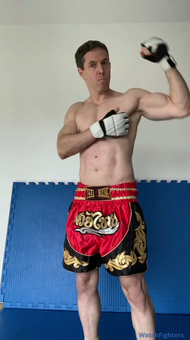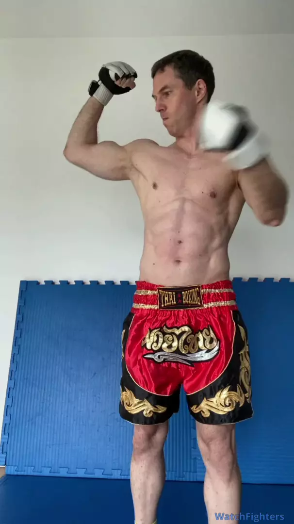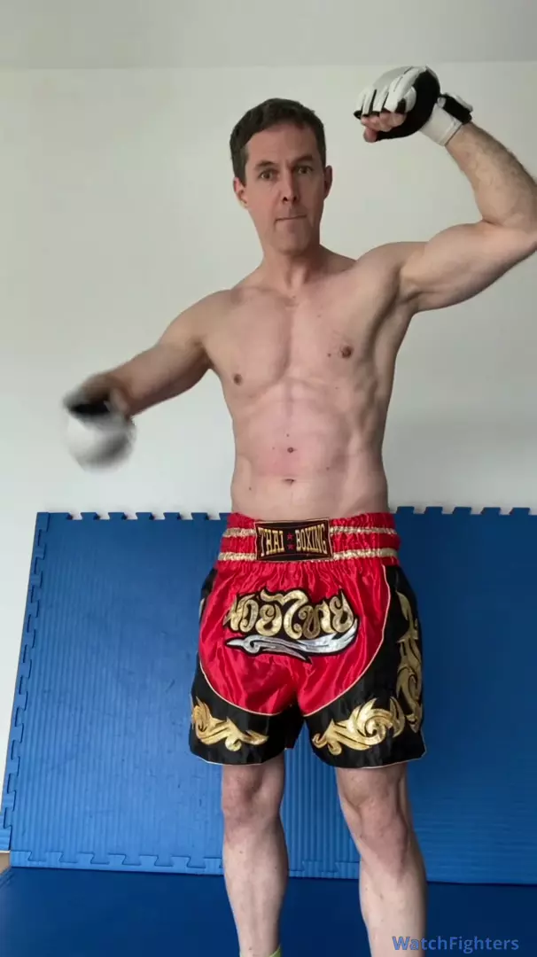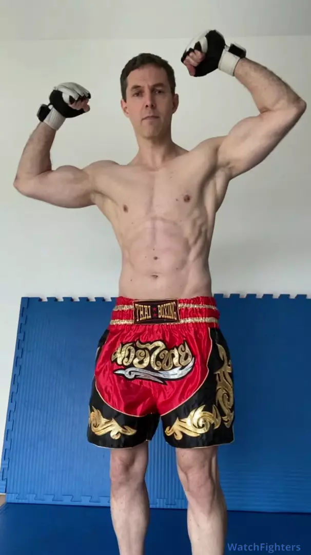 Doing a short flexing and self-punching with my new Muay Thai shorts and MMA gloves!
