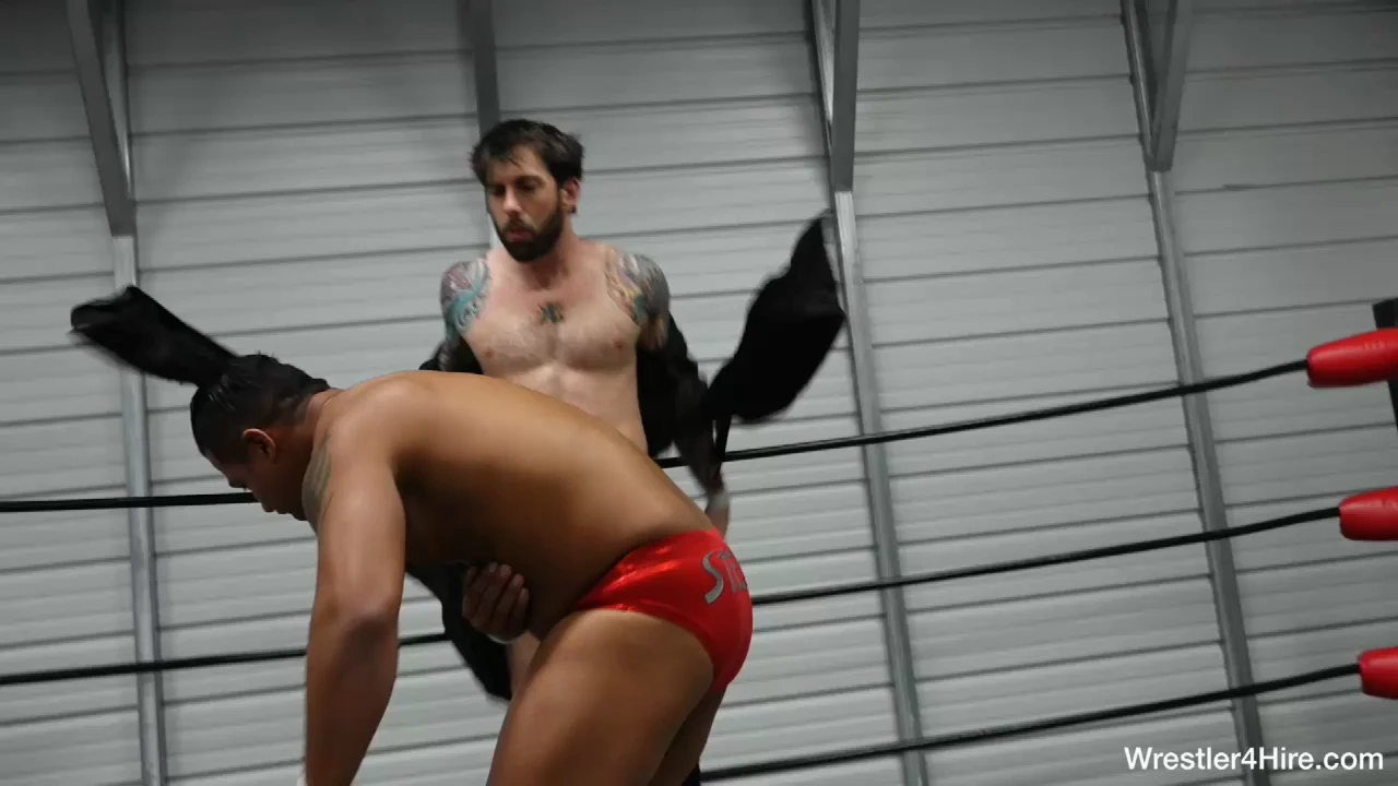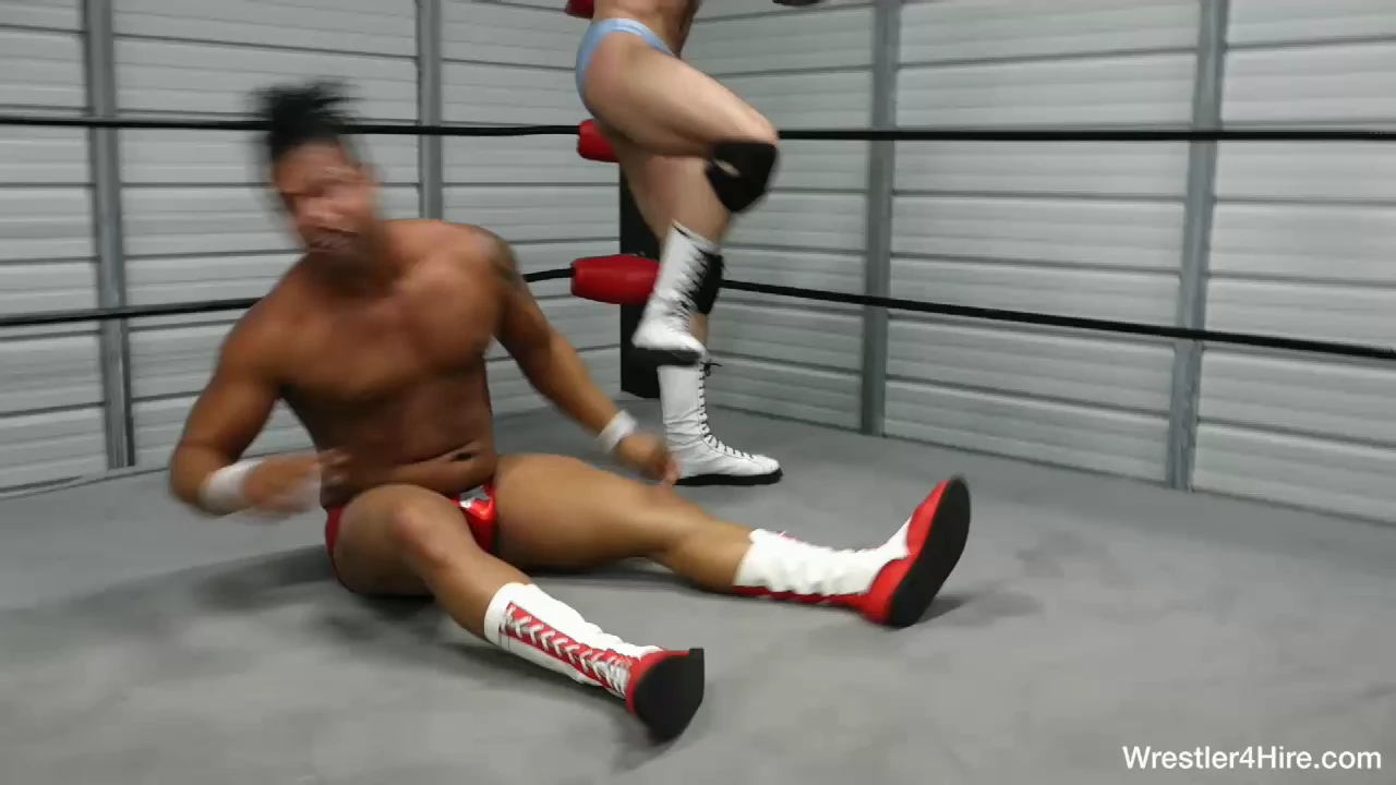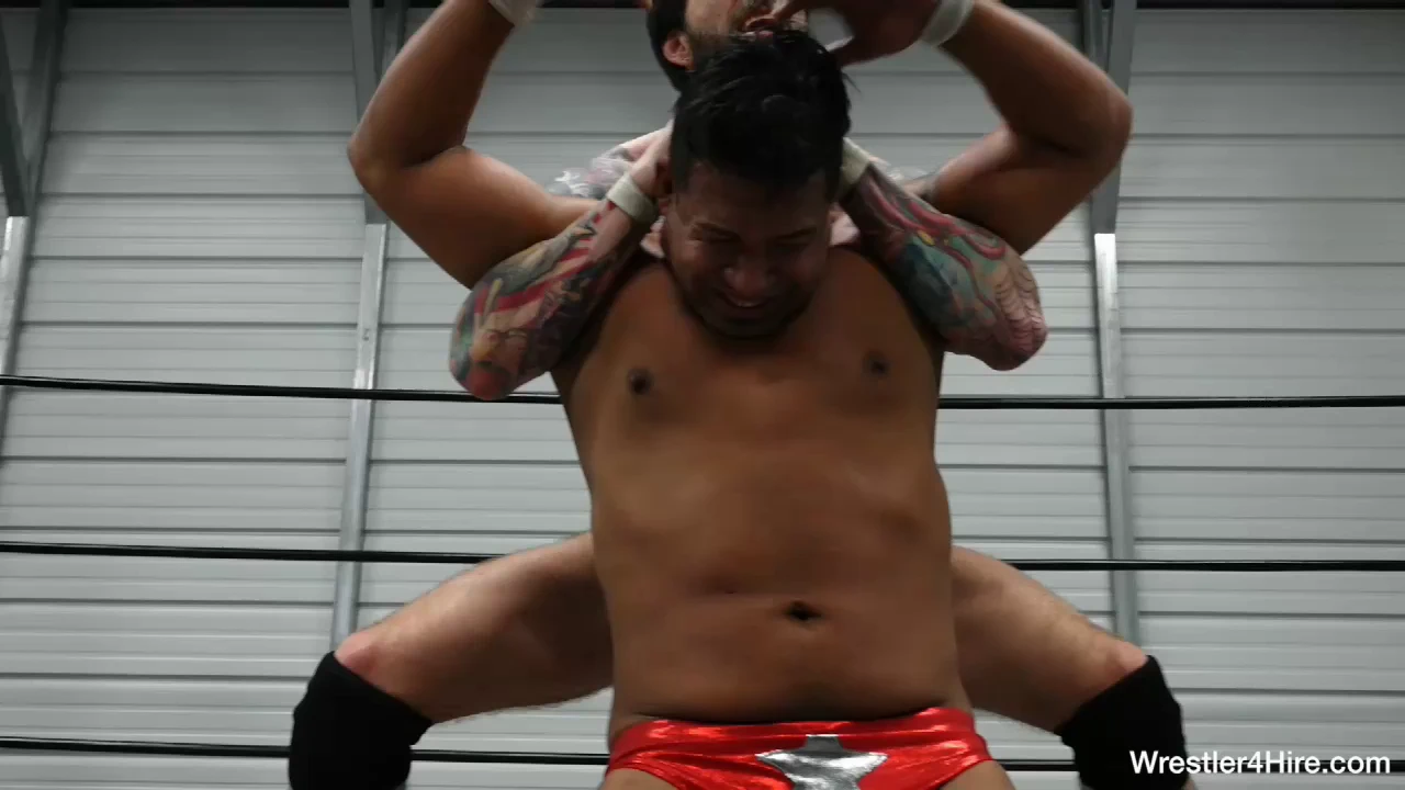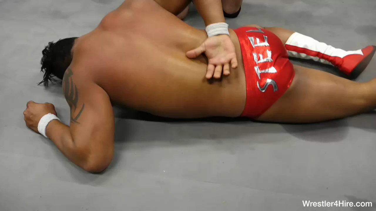 One has to admire Gabe’s stubbornness. Figure fours, scissors, gut punches, and against the ropes punishment leave Gabe shaken, but still stubborn. At last Karn exacts his most painful punishment on Karn, pulling him into what might be the most epic spladle ever filmed. It practically happens in slow motion with Karn locking Gabe up while standing, allowing the hold to literally fall into place as the two of them timber to the floor with a resounding thud. Can Gabe hold out in this humiliating hold? Or is Karn “The Man” after all?