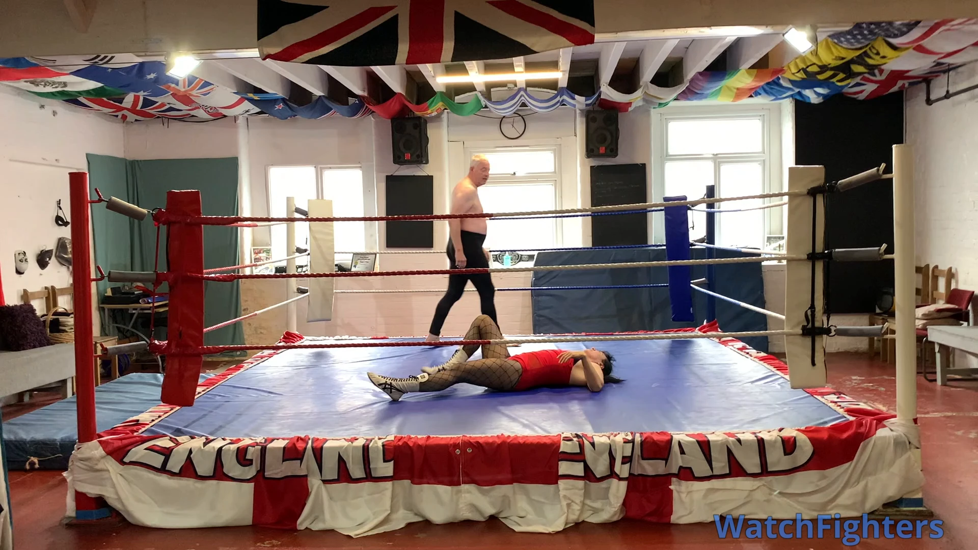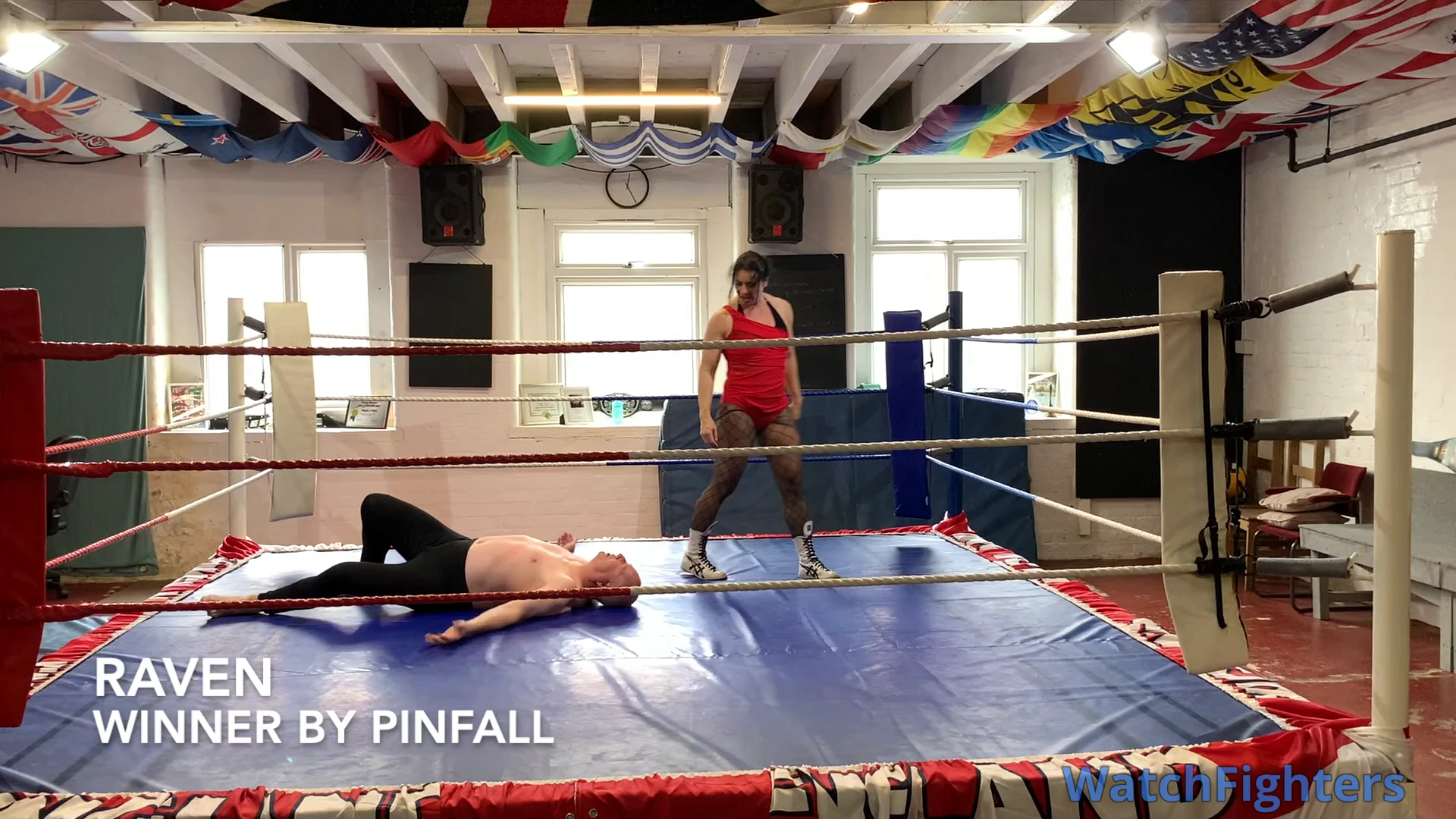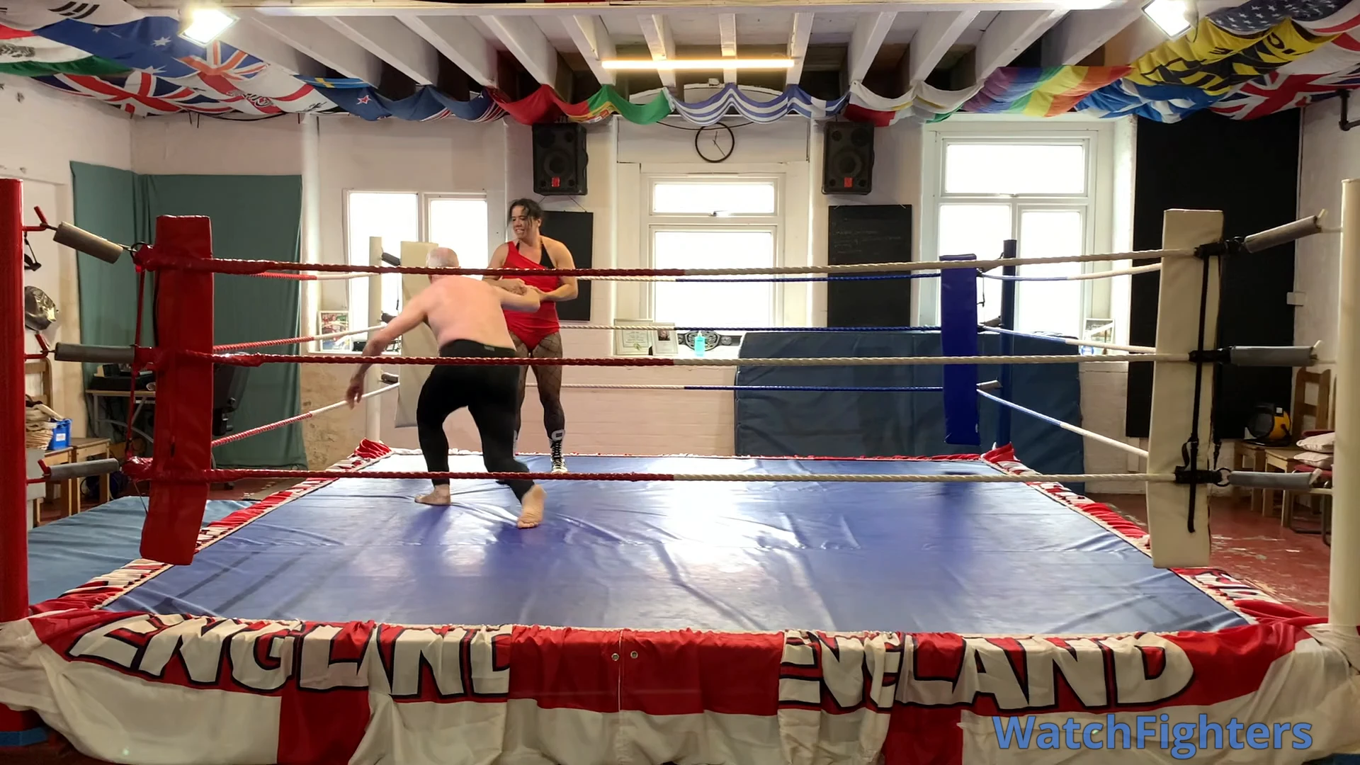 Action from a pro style mixed wrestling match featuring strong female session wrestler Raven v Stephen held at TWF Manchester.