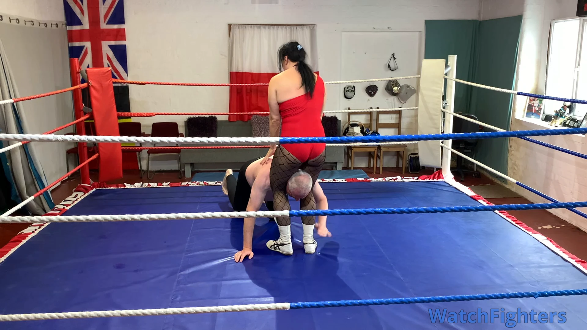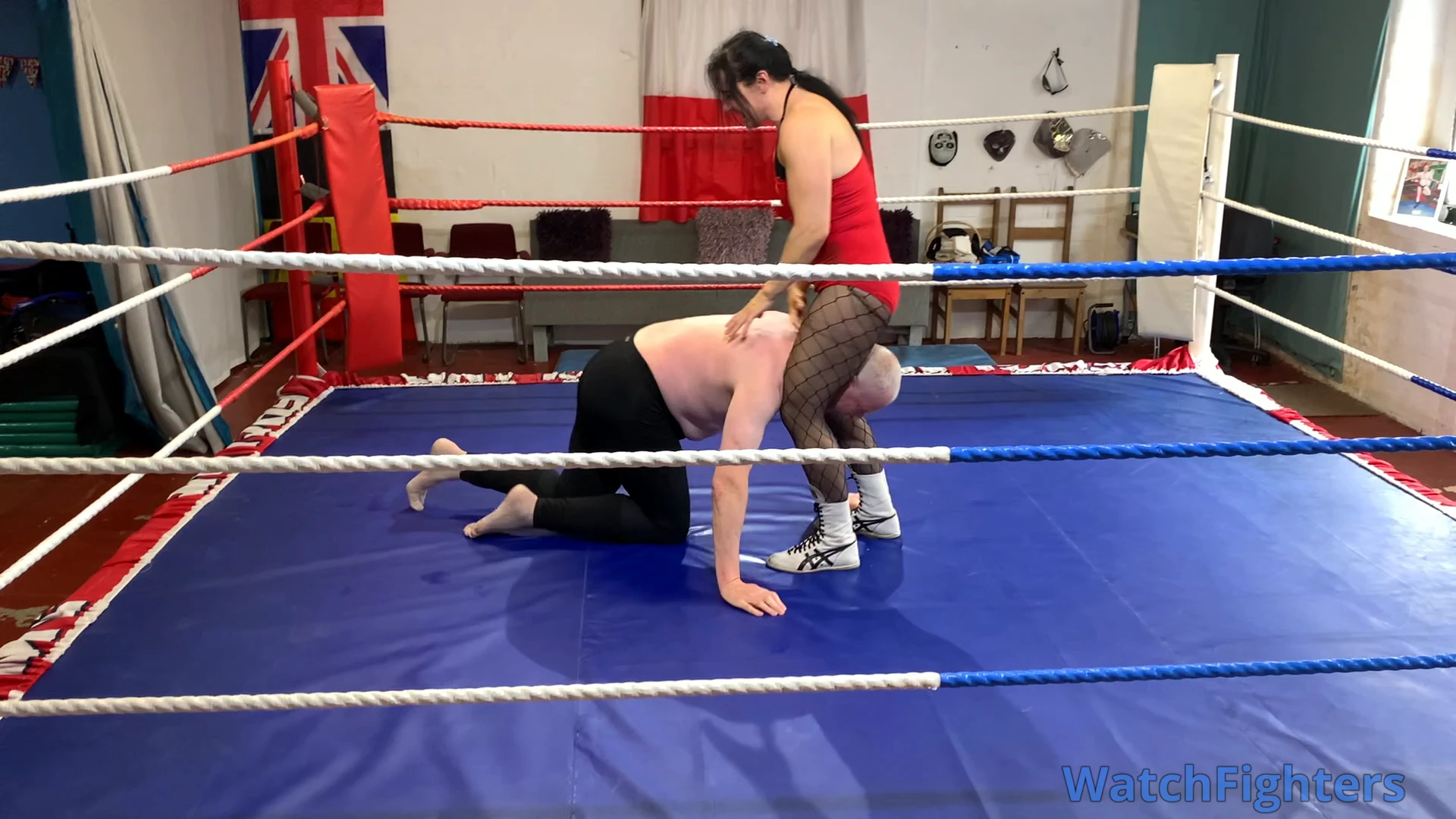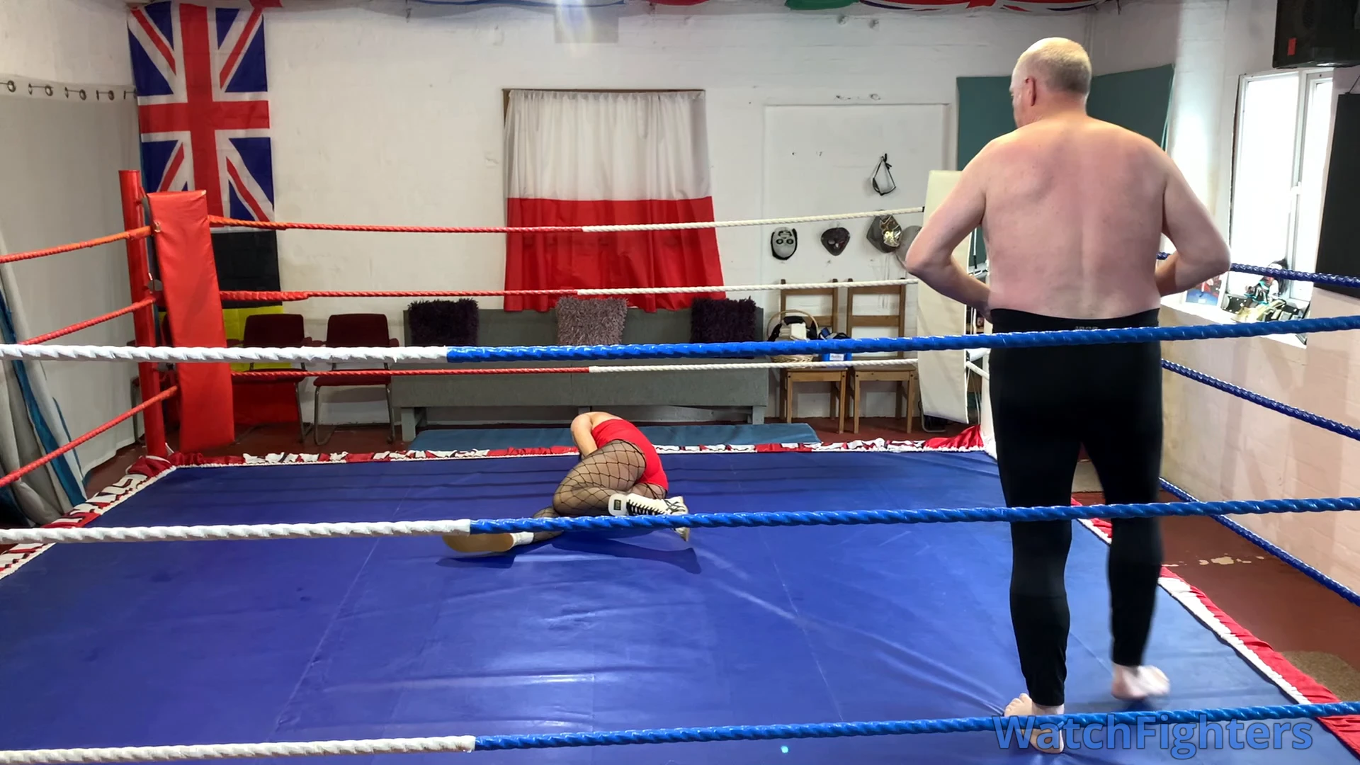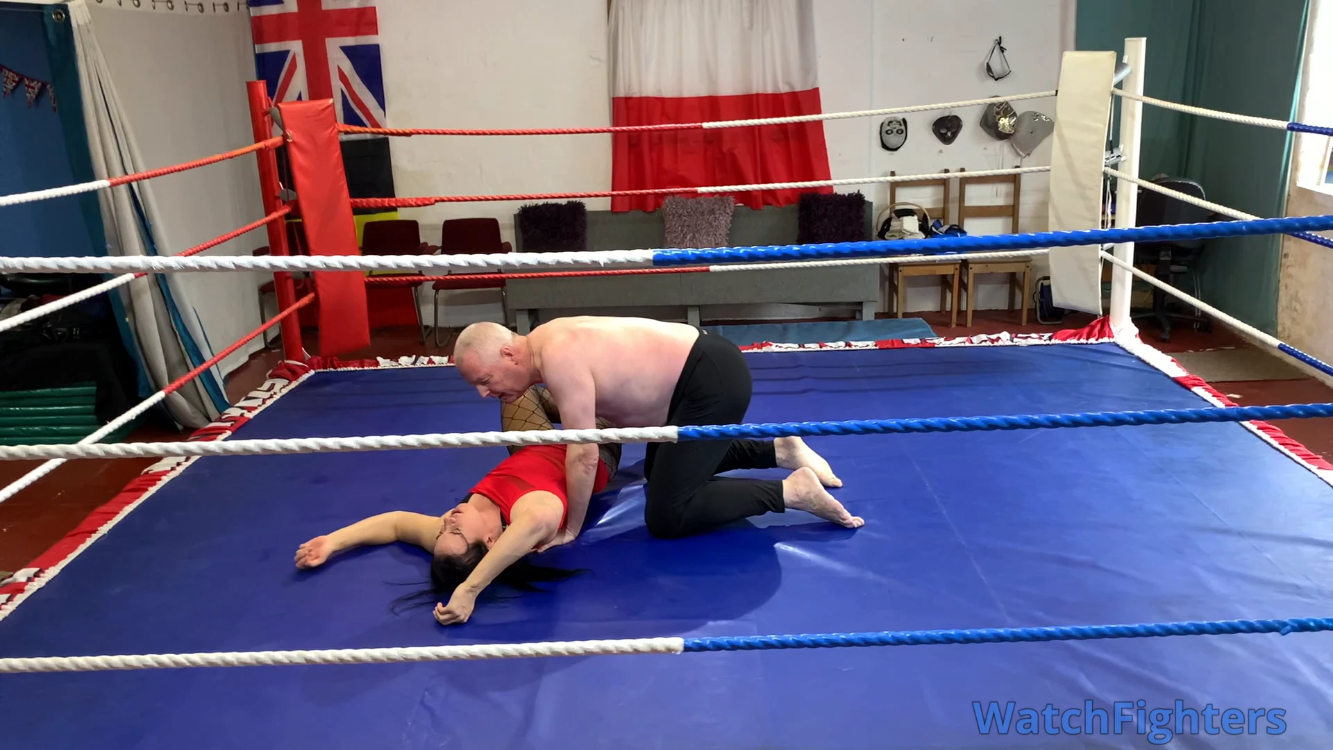 Action from a pro style mixed wrestling match featuring strong female session wrestler Raven v Stephen held at TWF Manchester.