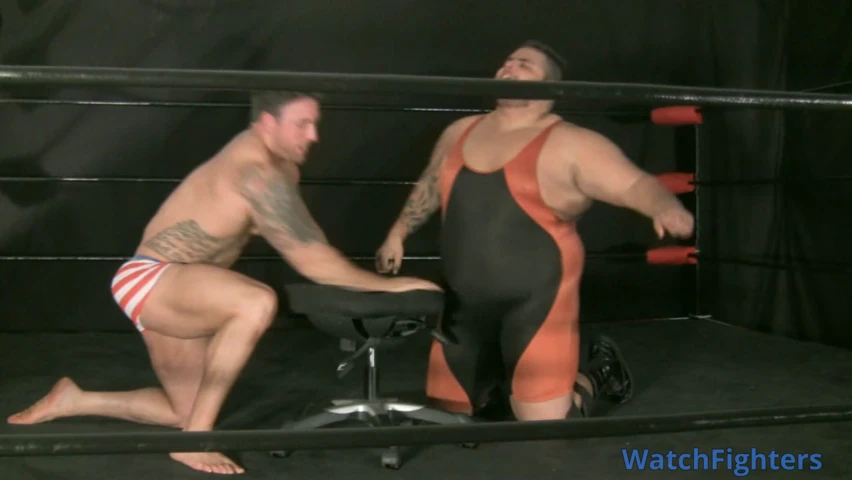 Mountain once again vows to make the bodybuilder submit, “Come on tap pussy, give up!” He hoists the massive Mutant up onto his shoulders, applying pressure to the neck and back of the bodybuilder. Mutant breaks free and unleashes a barrage of forearms, with a sudden burst of muscular power. The hard hunk even lifts the Mountain clean on his feet and delivers a spine buster! Suddenly all the cockiness of Mutant is becoming and overwhelming force and the Mountain’s trash talk is evaporating as he tends to his wounds. An even battle appears to be in store. Perhaps this new attitude of Mutant and sudden ring proficiency will even give him the edge over the undefeated, seemingly insurmountable force that is the Mountain. Will Mutant be the first bodybuilder to conquer to the bodybuilder crusher? Or will the handsome hunk once again fall victim to the overwhelming aggression and in ring dominance of the mighty force, the Mountain!