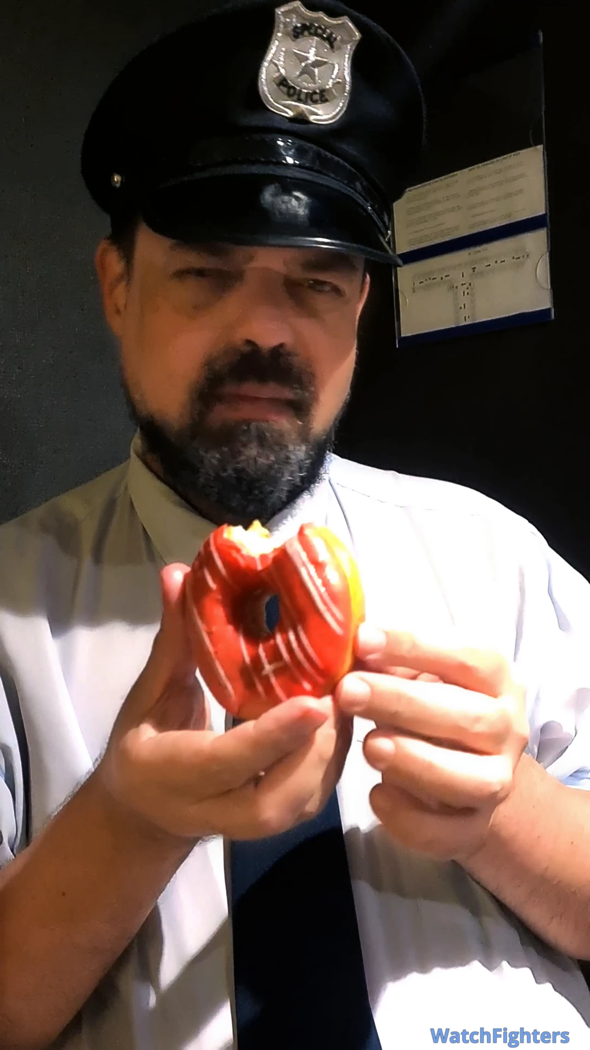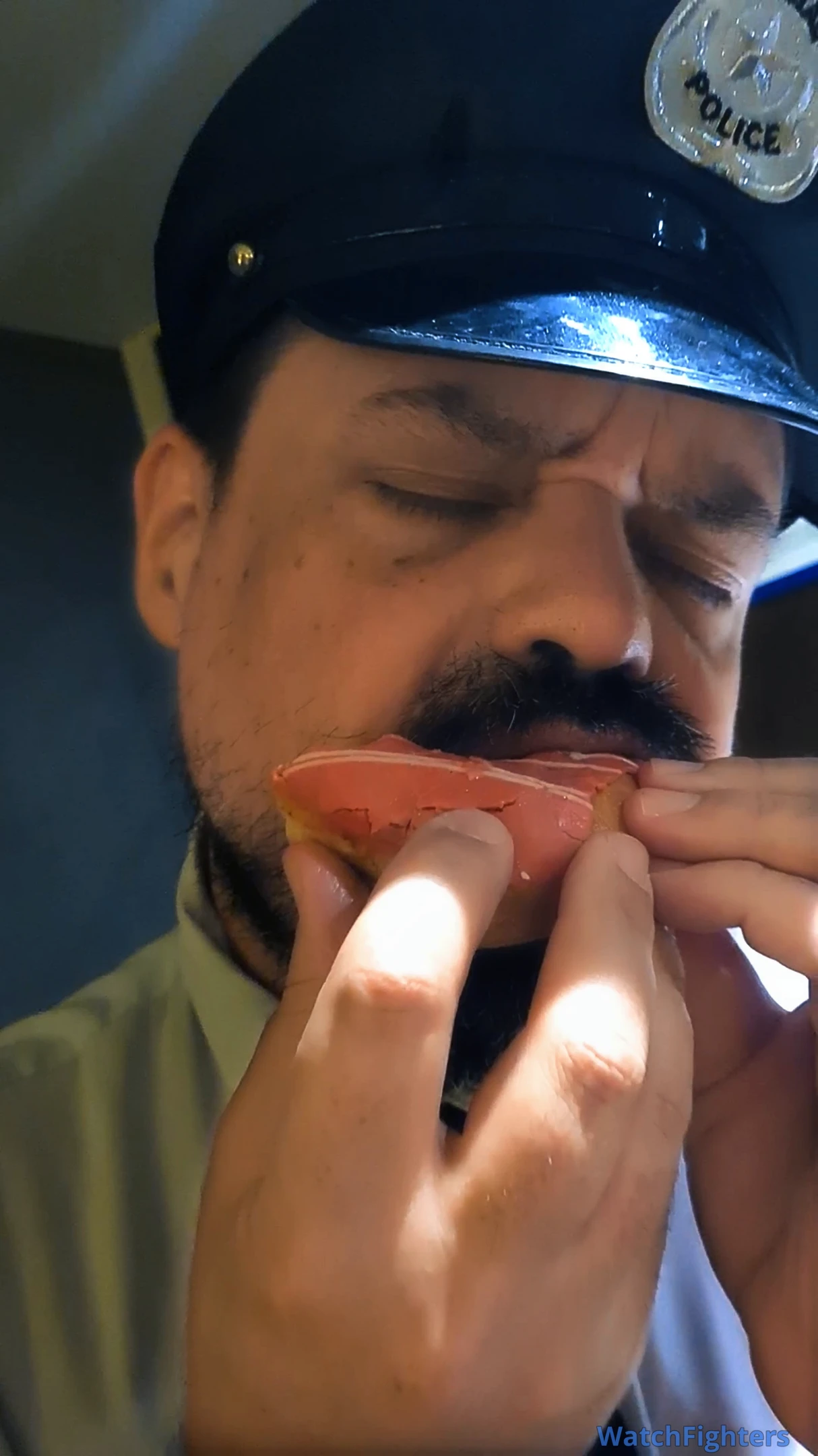 Calm and intimidating, the Bear Cop takes his time. He enjoys a donut, savoring every bite, watching you closely — control without words. The tension builds as the scene shifts into worship and dominance, with the officer slowly removing his uniform, piece by piece, showing his heavy body and powerful presence until he’s down to his swim briefs.