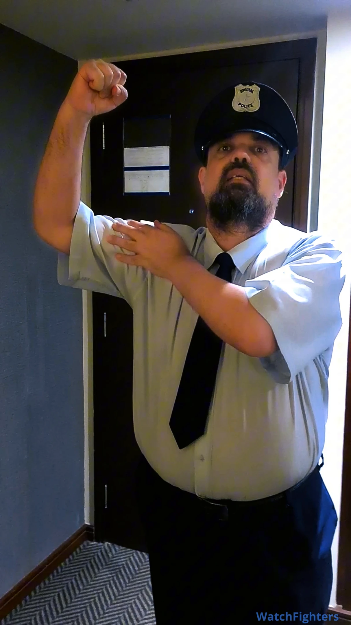 You’re alone in a hotel room when a uniformed Bear Cop steps in. Big, bearded, chubby, and confident — he’s here for a wanted suspect… you. This is a POV fetish roleplay, placing you face to face with raw authority.