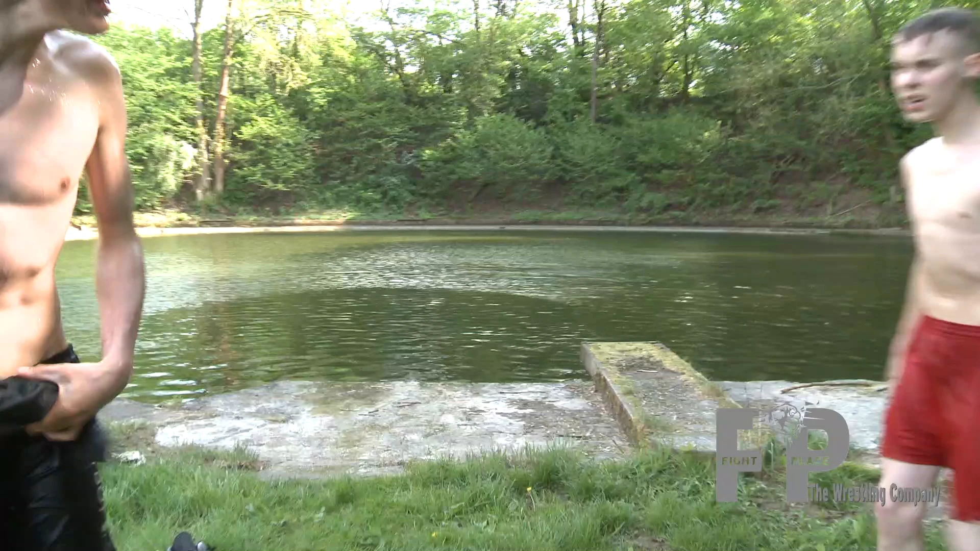 Joe and Jermaine meet at a small pond. They decide to test their strength with an arm-wrestling match. When Jermaine realizes he’s about to lose, he grabs Joe and drags him toward the water. Once there, he tries to throw him in. Joe fights back, and during the scuffle by the pond, not only does Joe fall into the water - he pulls Jermaine in with him. Now things really heat up. Since the Fightplace mats are just around the corner, they decide to continue the fight there.