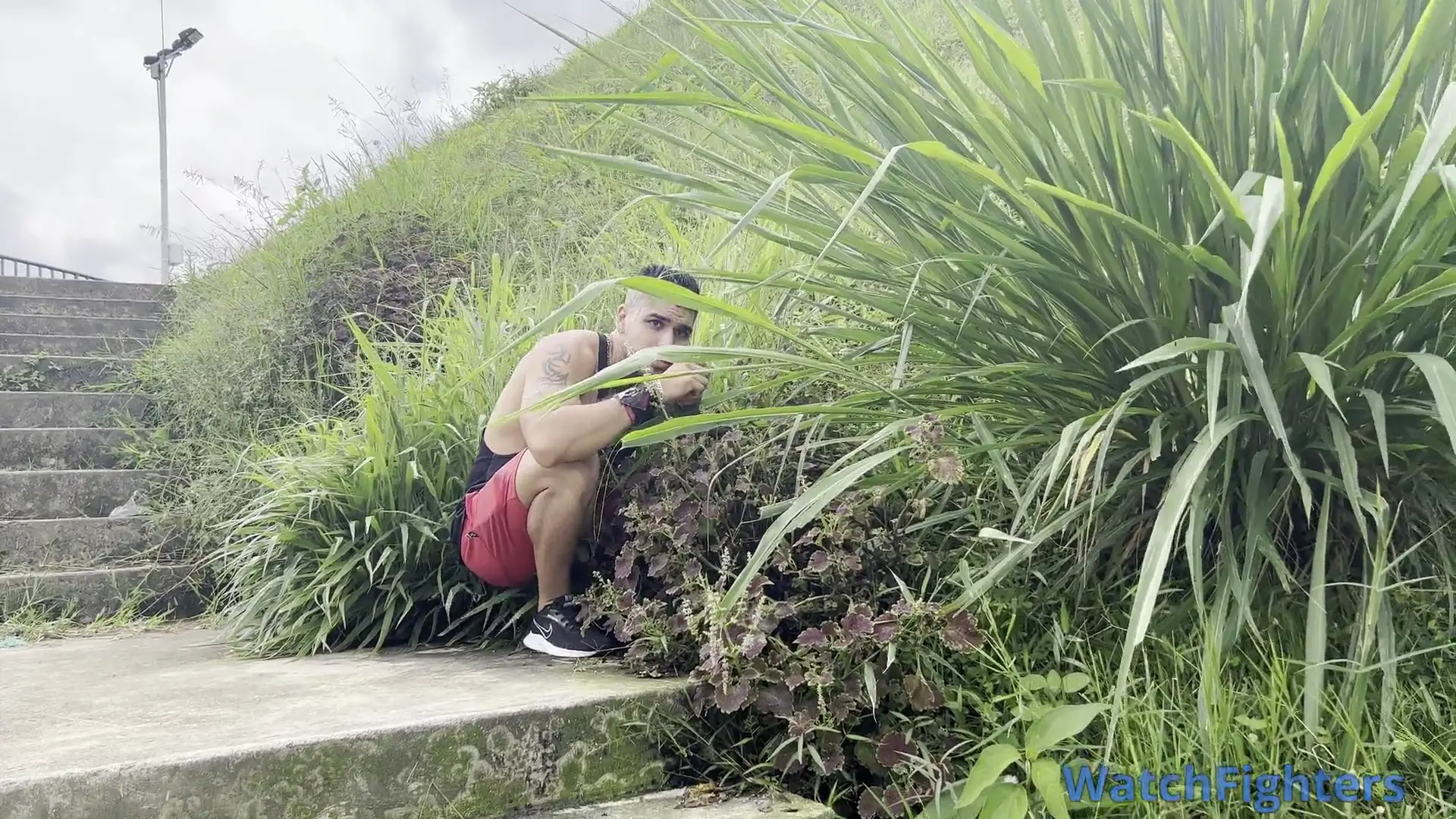 English: Steve Cass is running from the boss' two thugs in a secluded park. They interrogate him for stealing from their boss. He is continuously winded from intense punches into his stomach by each of the thugs. Steve pleads with the men, telling them "It was not me." Samir Hazard is jogging in the area and hears the sound of someone being beaten. He tries to hide and watch the action. He makes a noise and the two thugs chase him.