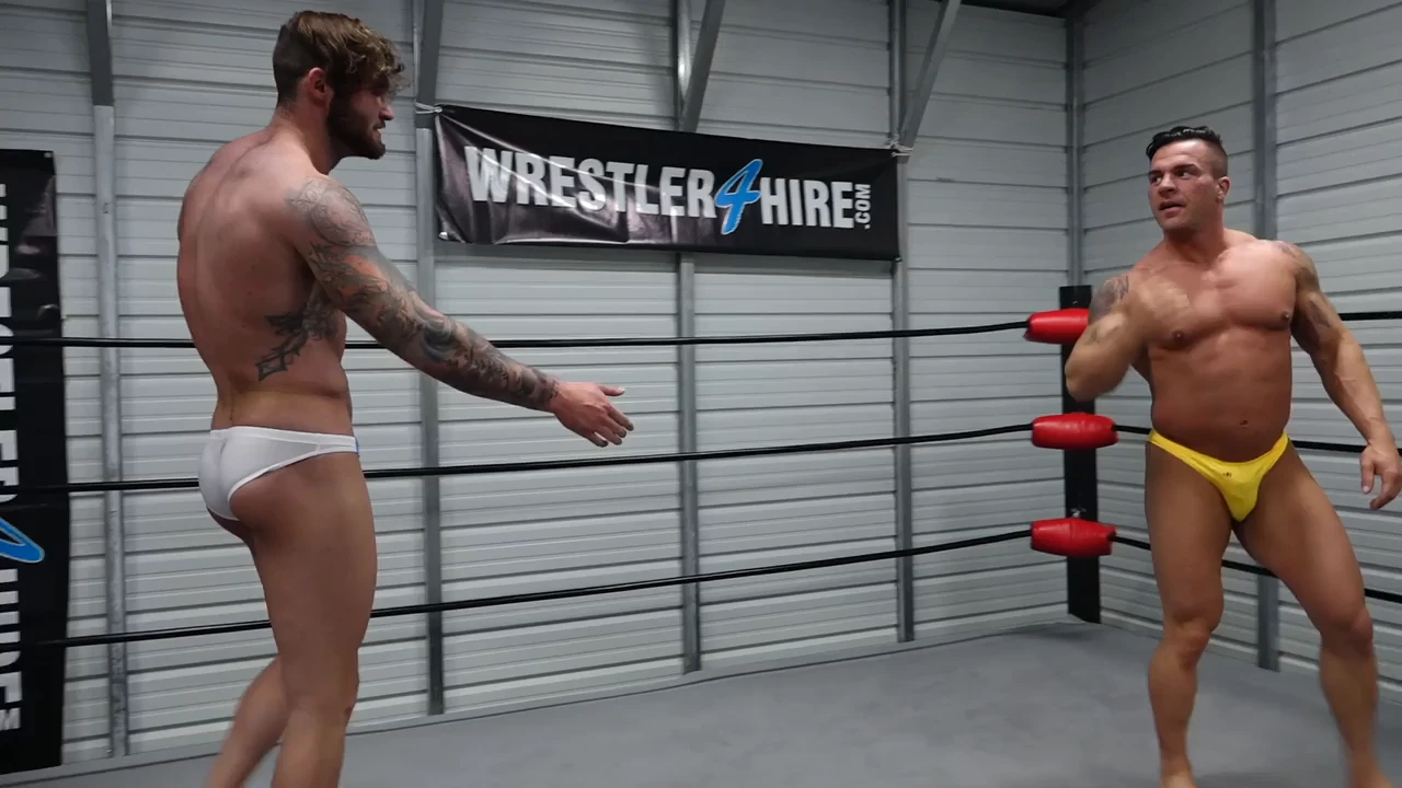 A battle of the bearhugs and tests of strength. This match is all about making the other submit to a bearhug or in a test of strength. Xander is very tall, muscular, covered in tattoos, and is wearing the smallest pair of white trunks he could find. He has a significant height advantage over Braden, who is looking quite sexy in his yellow thong, but Braden definitely has a lot more muscle.