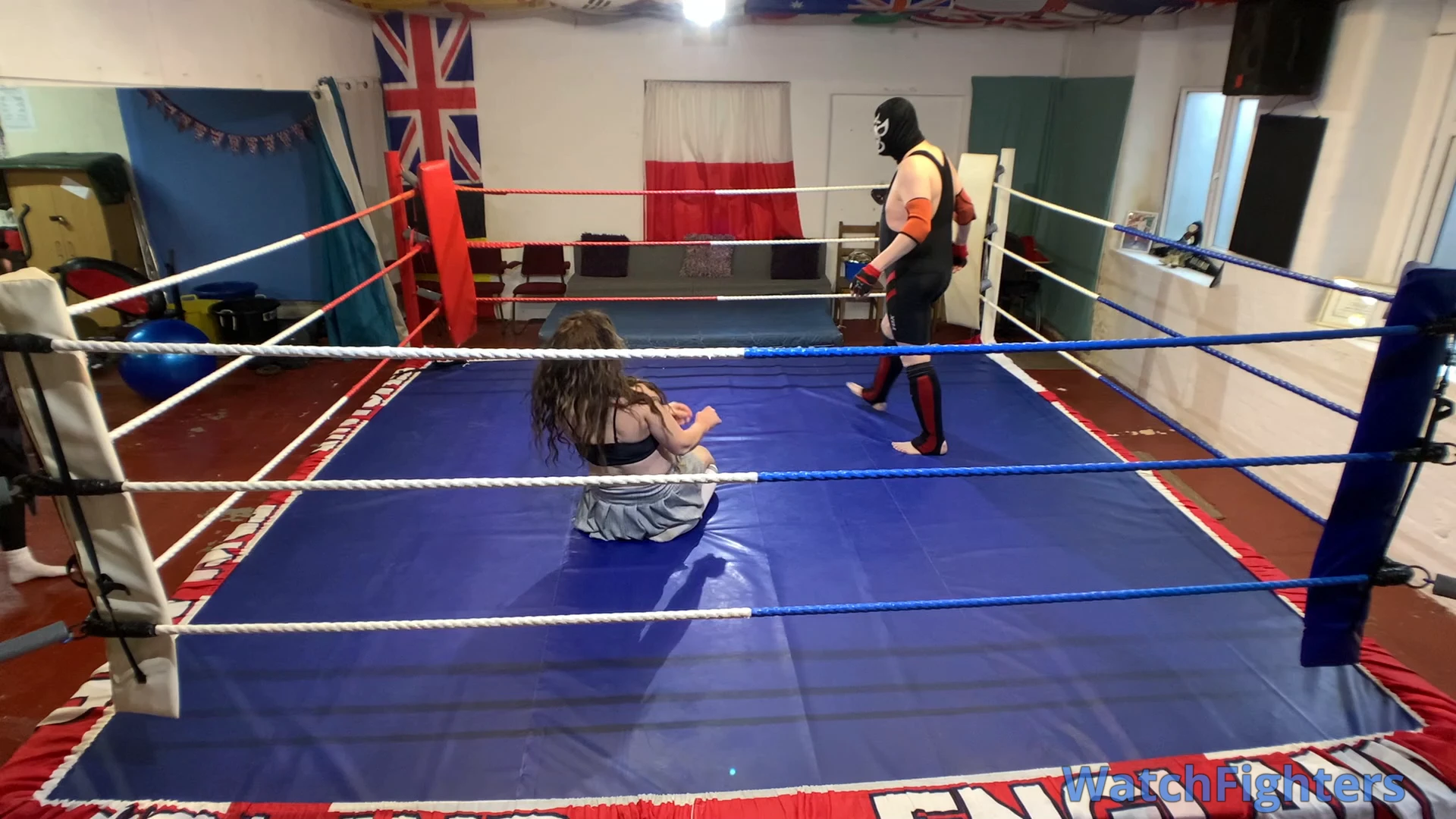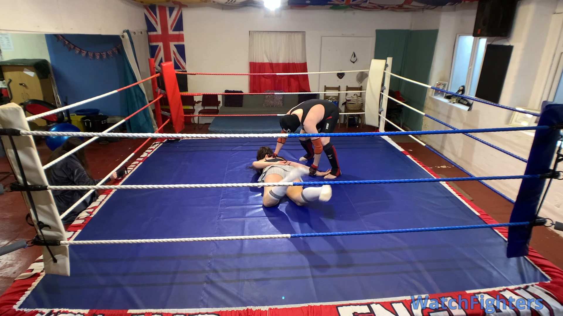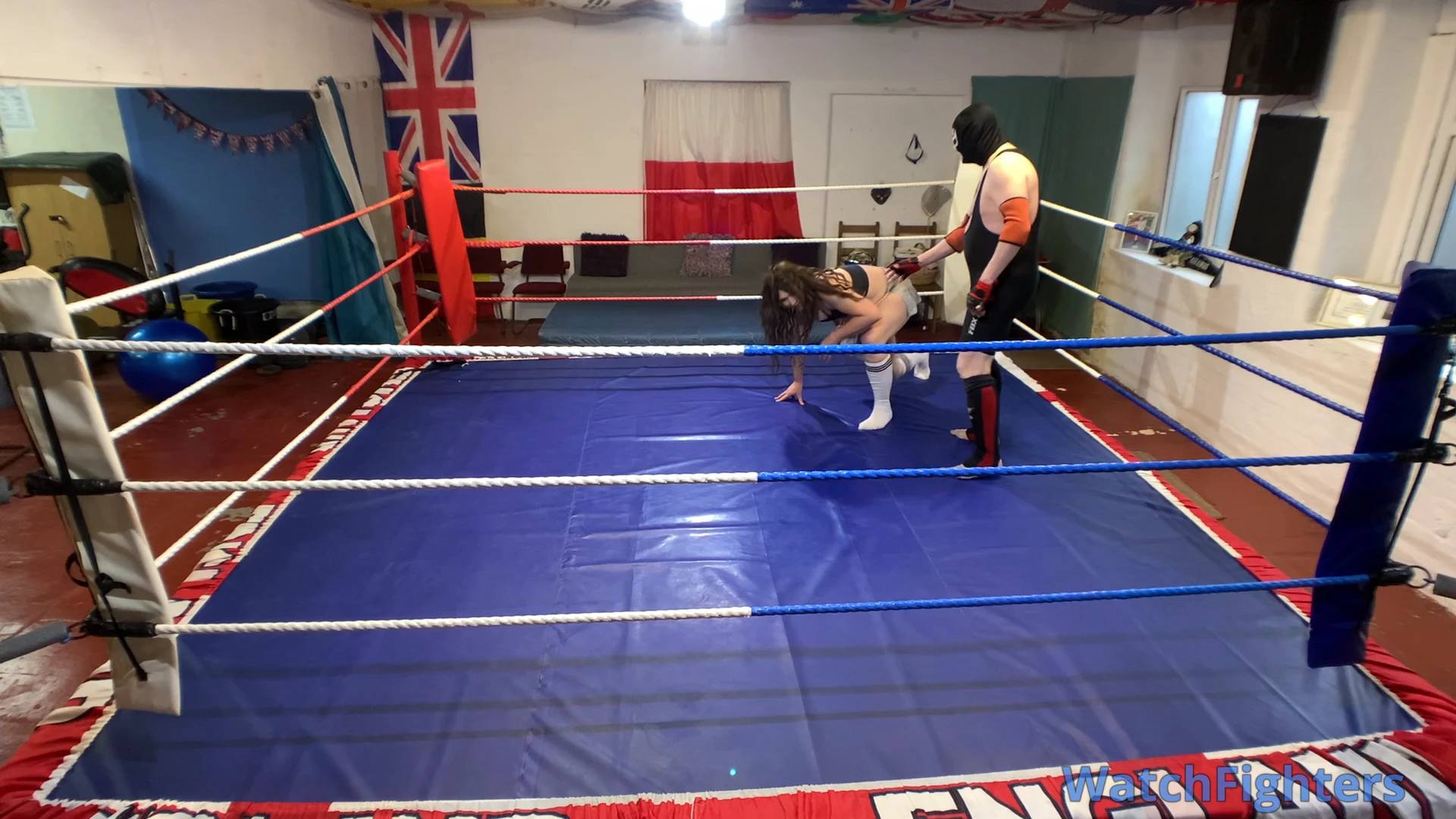 Action from a pro style mixed wrestling match featuring the trans female Nova Payne v Ghoul held at TWF Manchester.
