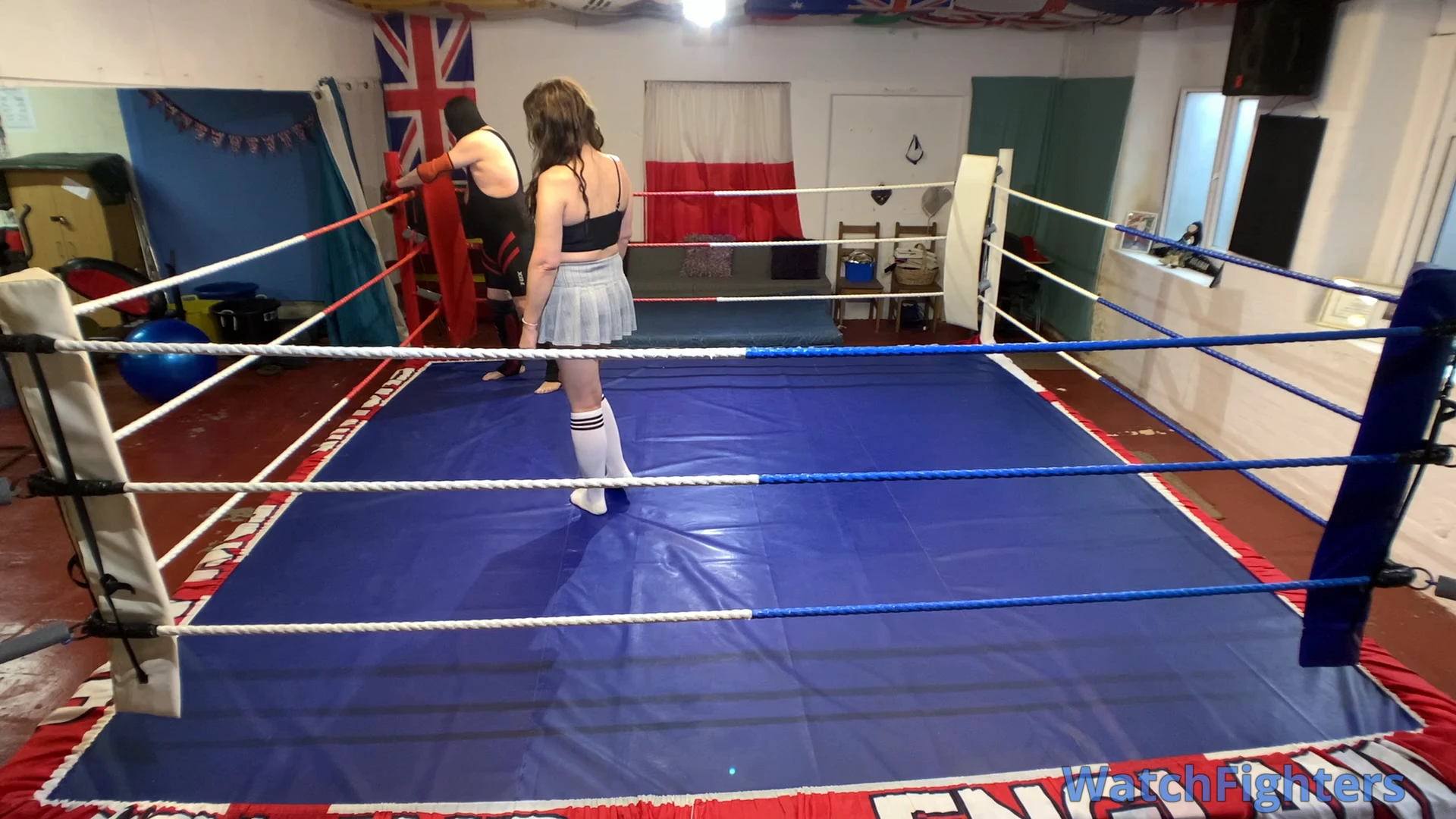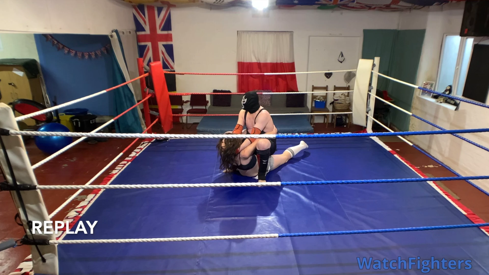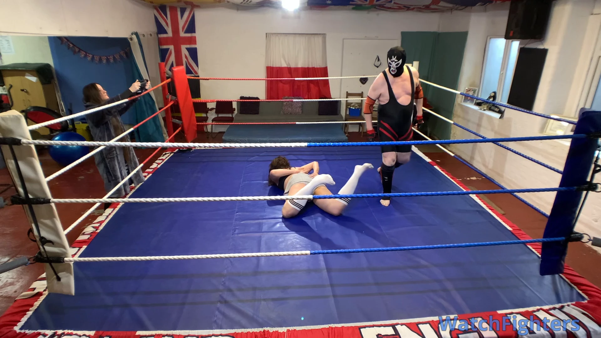 Action from a pro style mixed wrestling match featuring the trans female Nova Payne v Ghoul held at TWF Manchester.