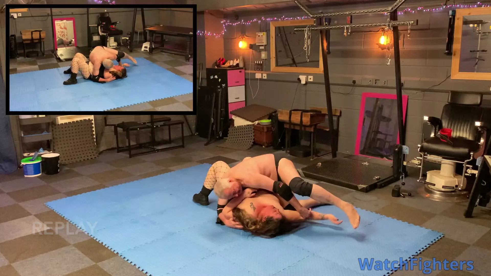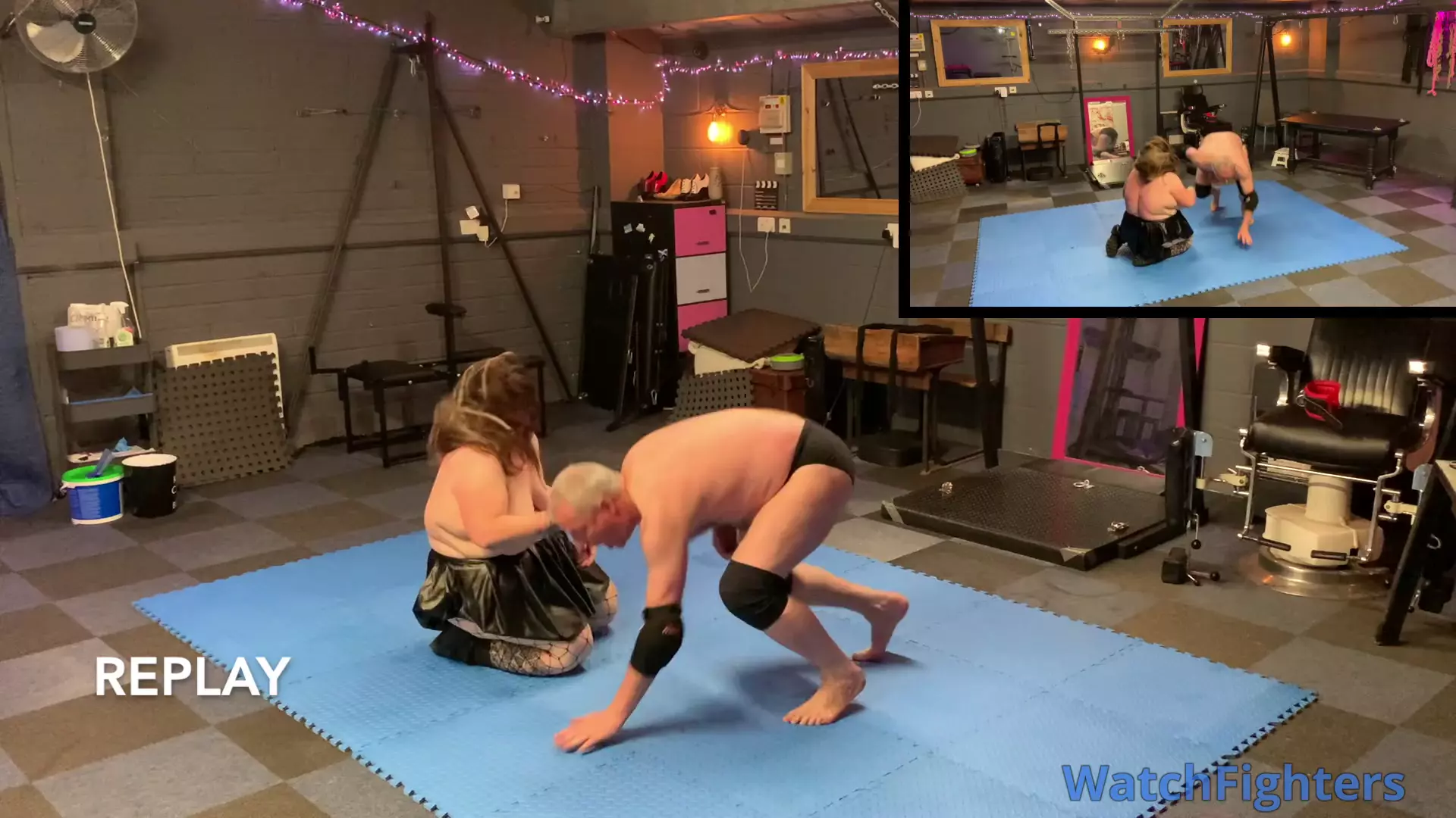 Action from a pro style mixed wrestling dungeon match featuring strong BBW, Kate O'Ninetails v Stephen held at TBO.