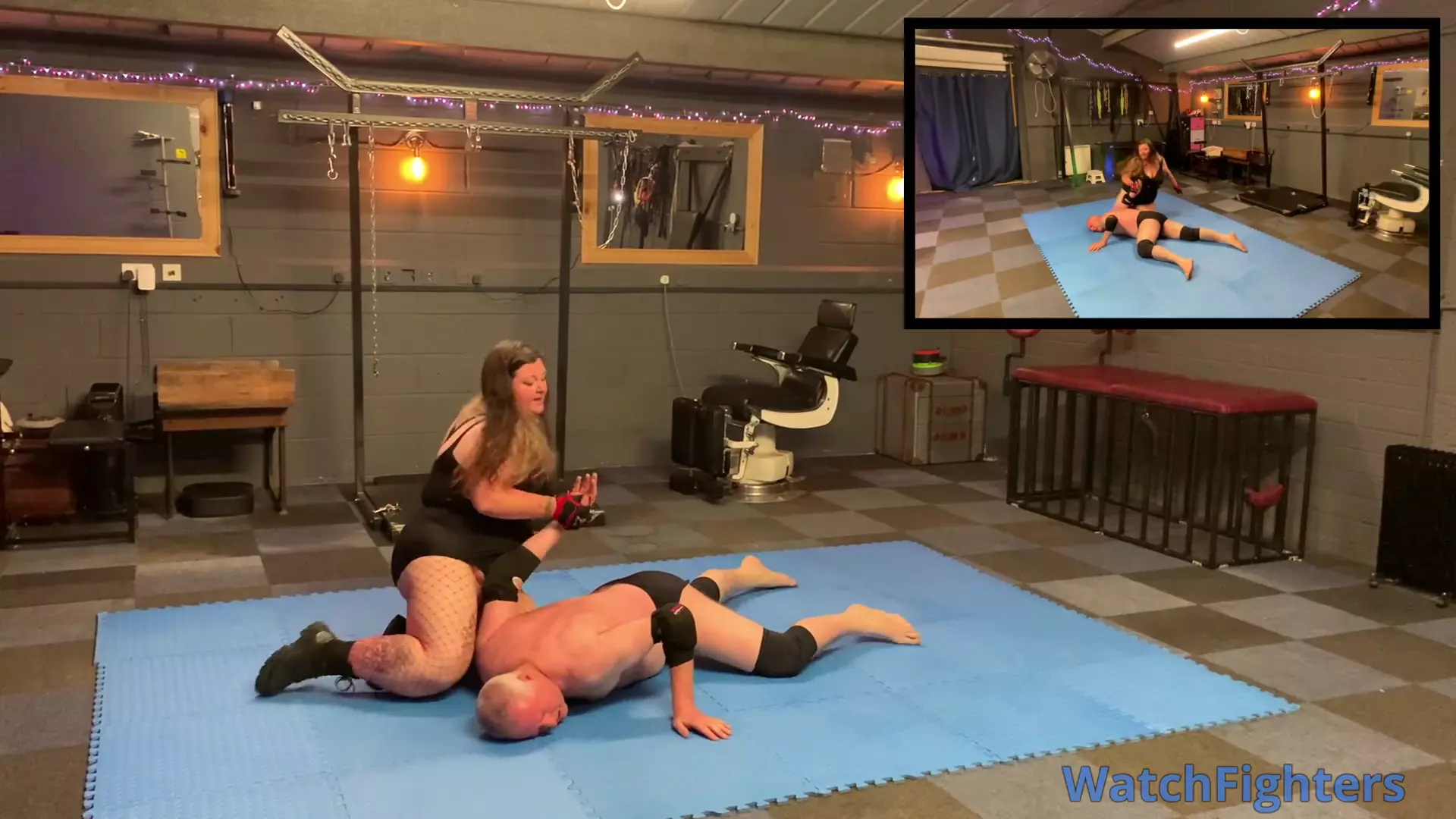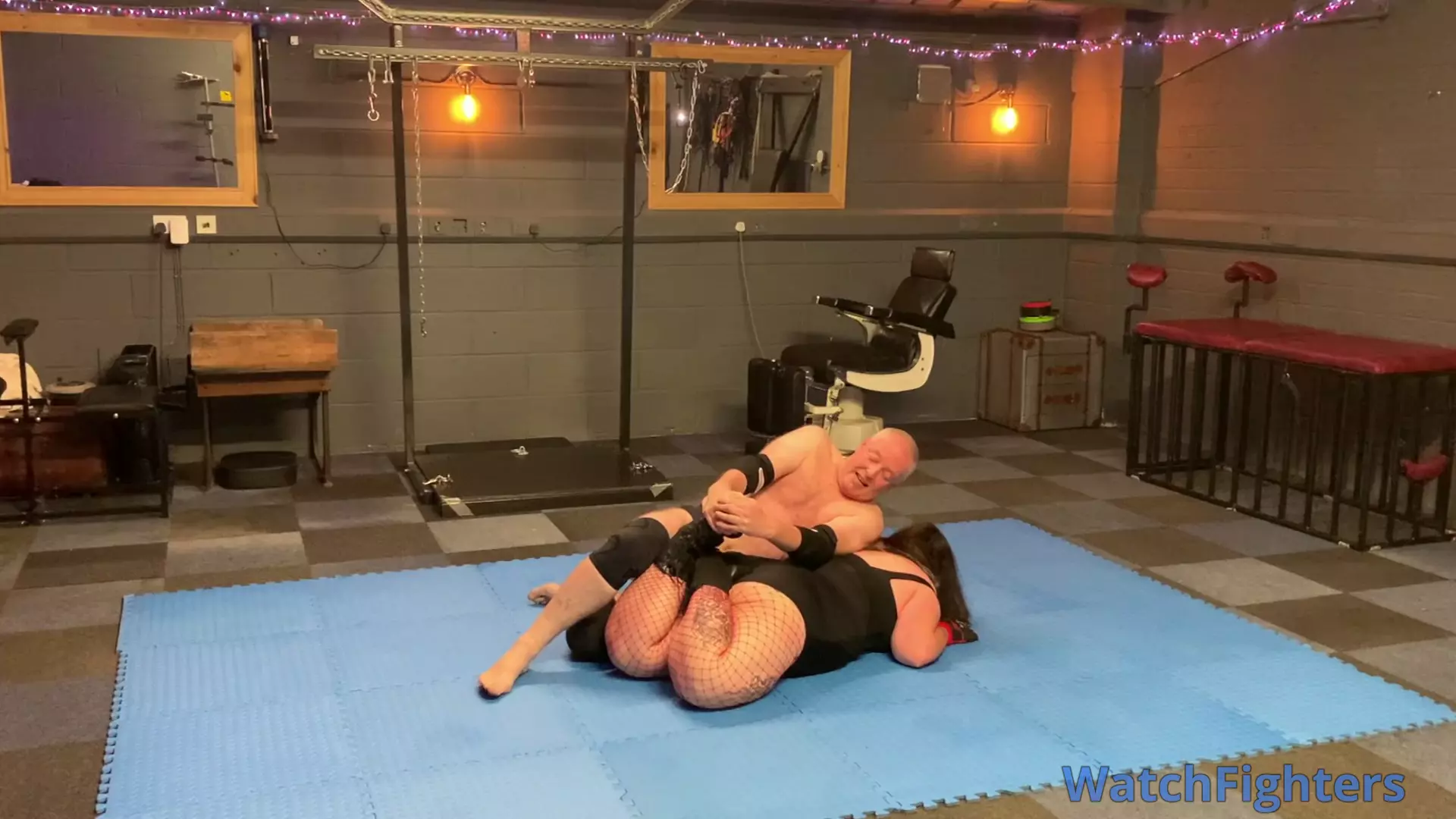 Action from a pro style mixed wrestling dungeon match featuring strong BBW, Kate O'Ninetails v Stephen held at TBO.