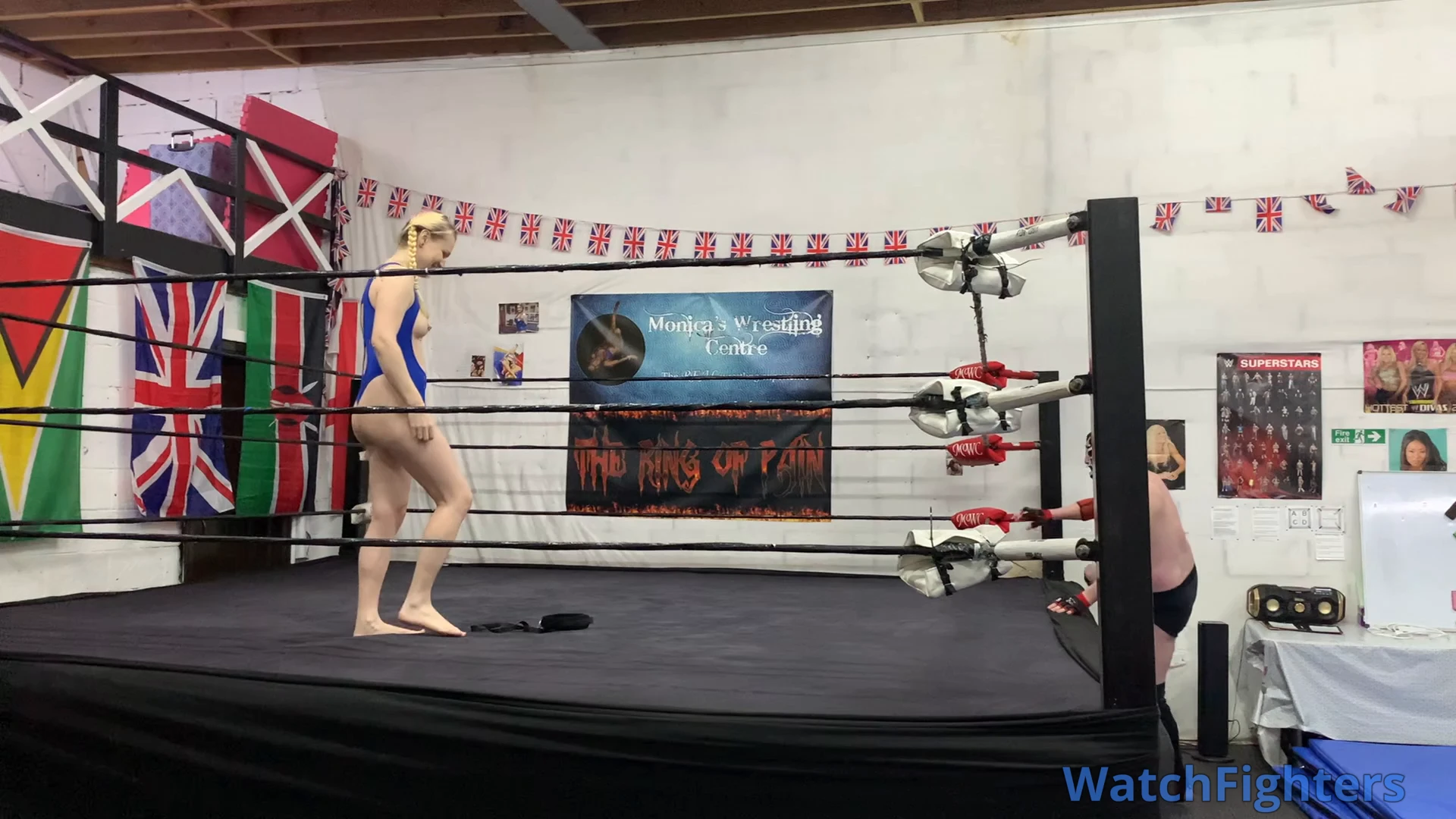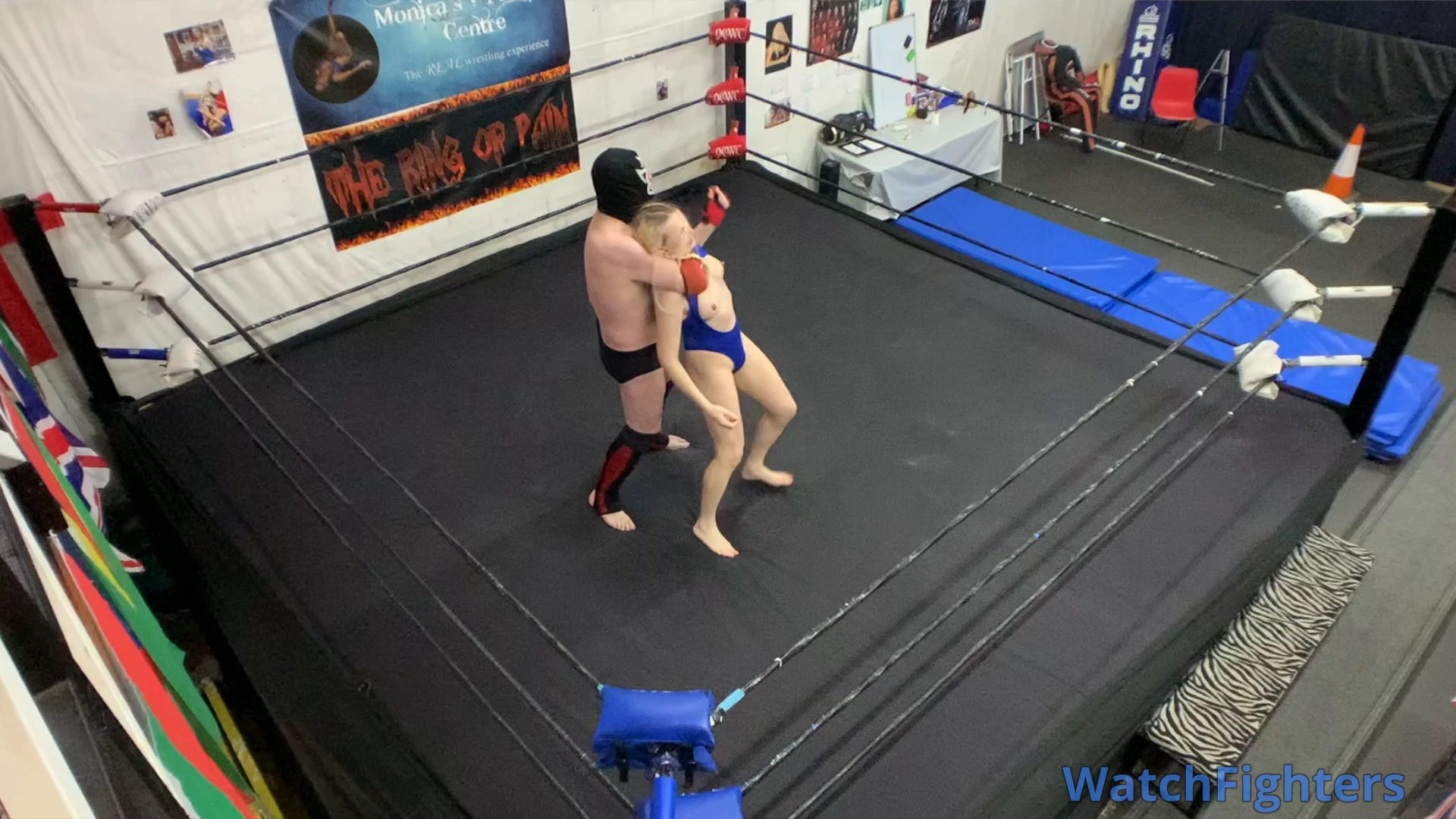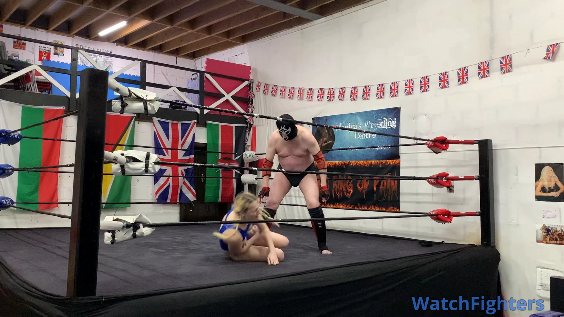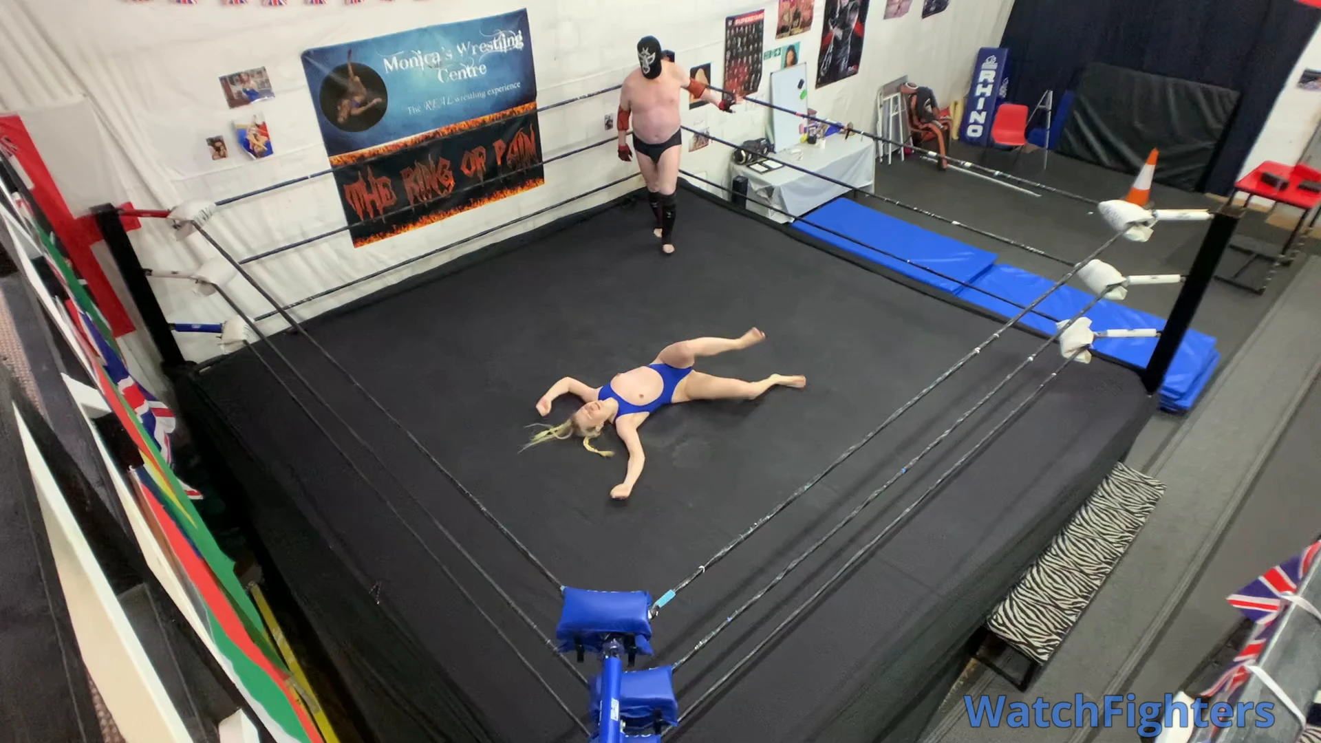 Action from a pro style mixed wrestling match featuring trans female wrestler Kinky Kat v Ghoul held at MWC London.