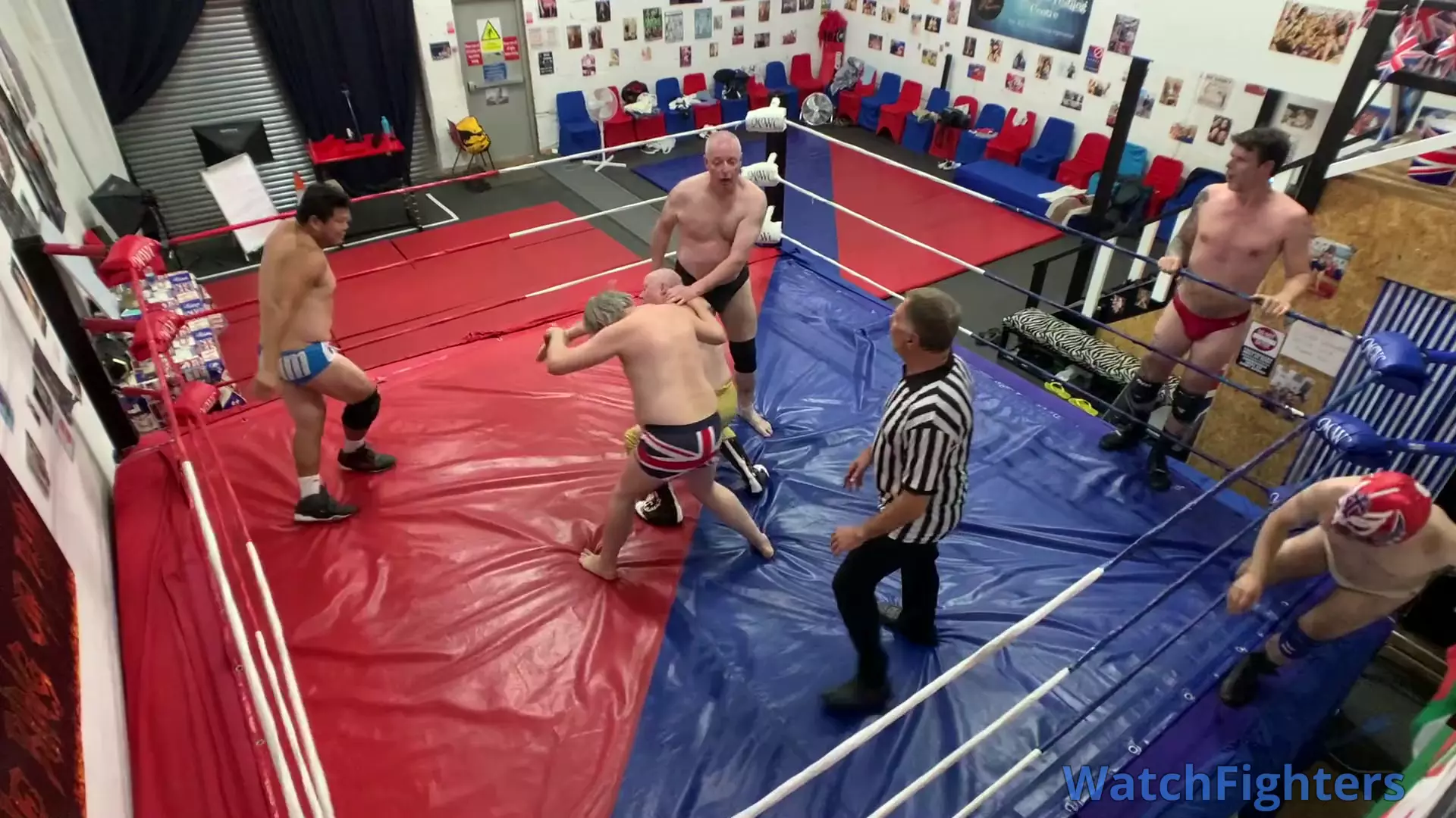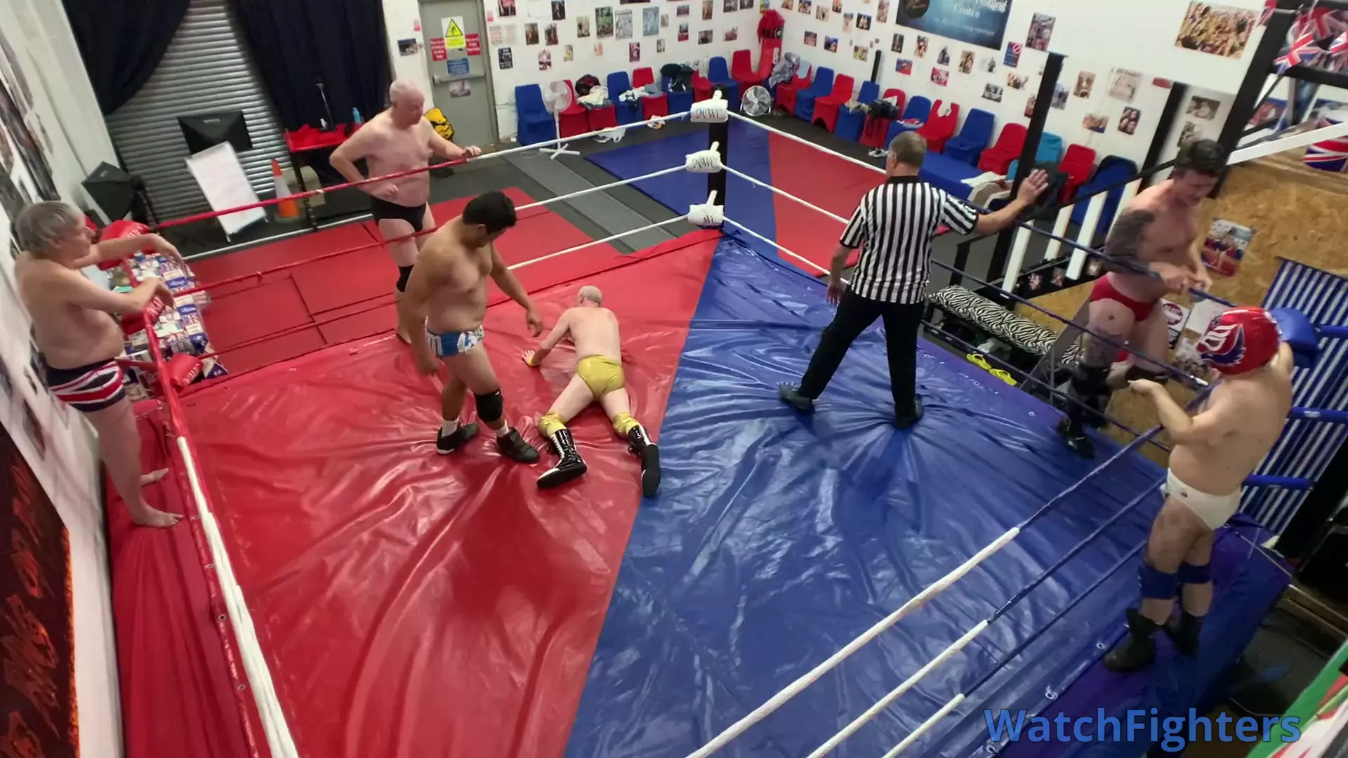 Action from an old school 'World of Sport" style 6 man tag team match featuring Golden Trio v Pain Project @ MWC London.