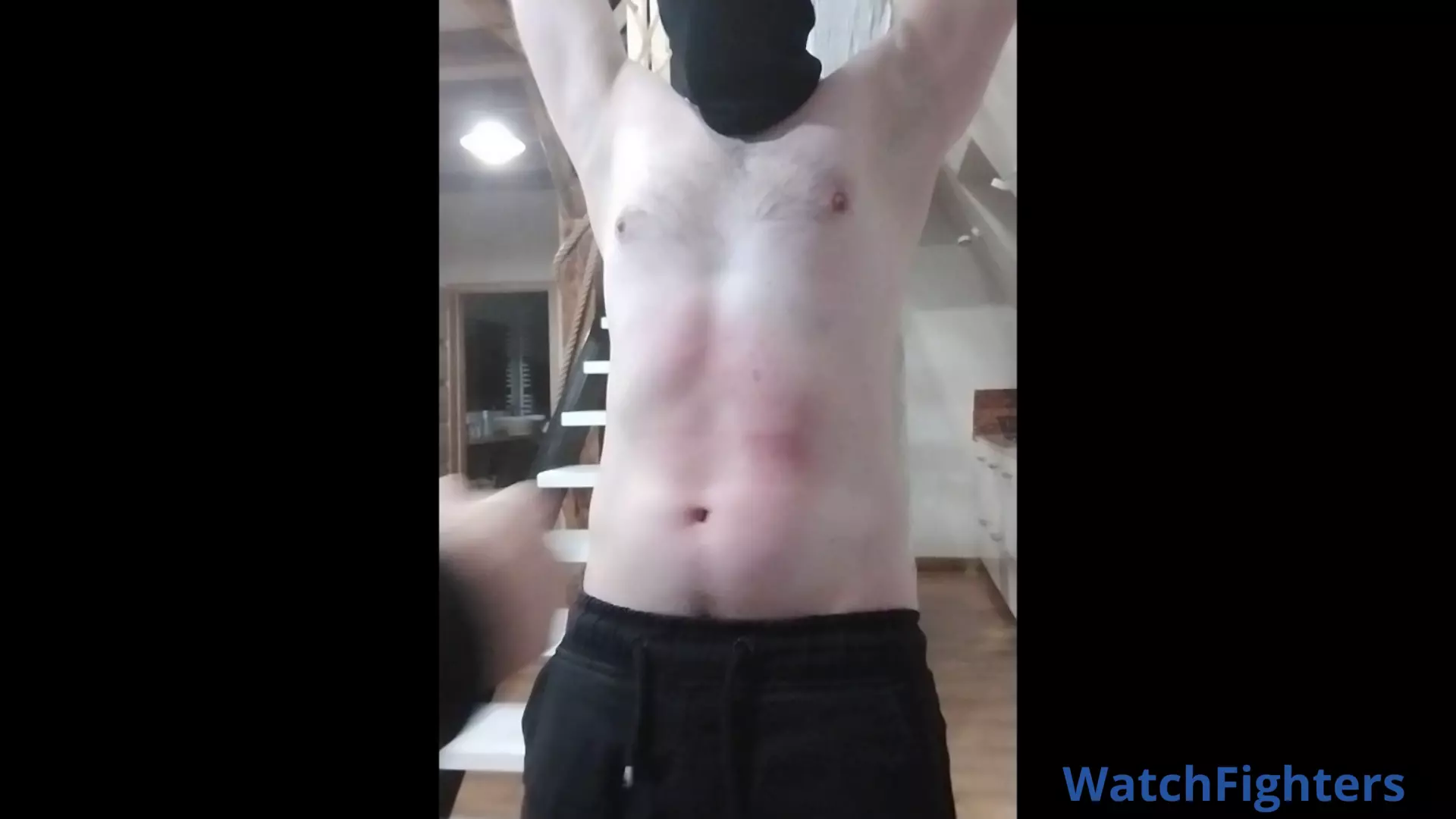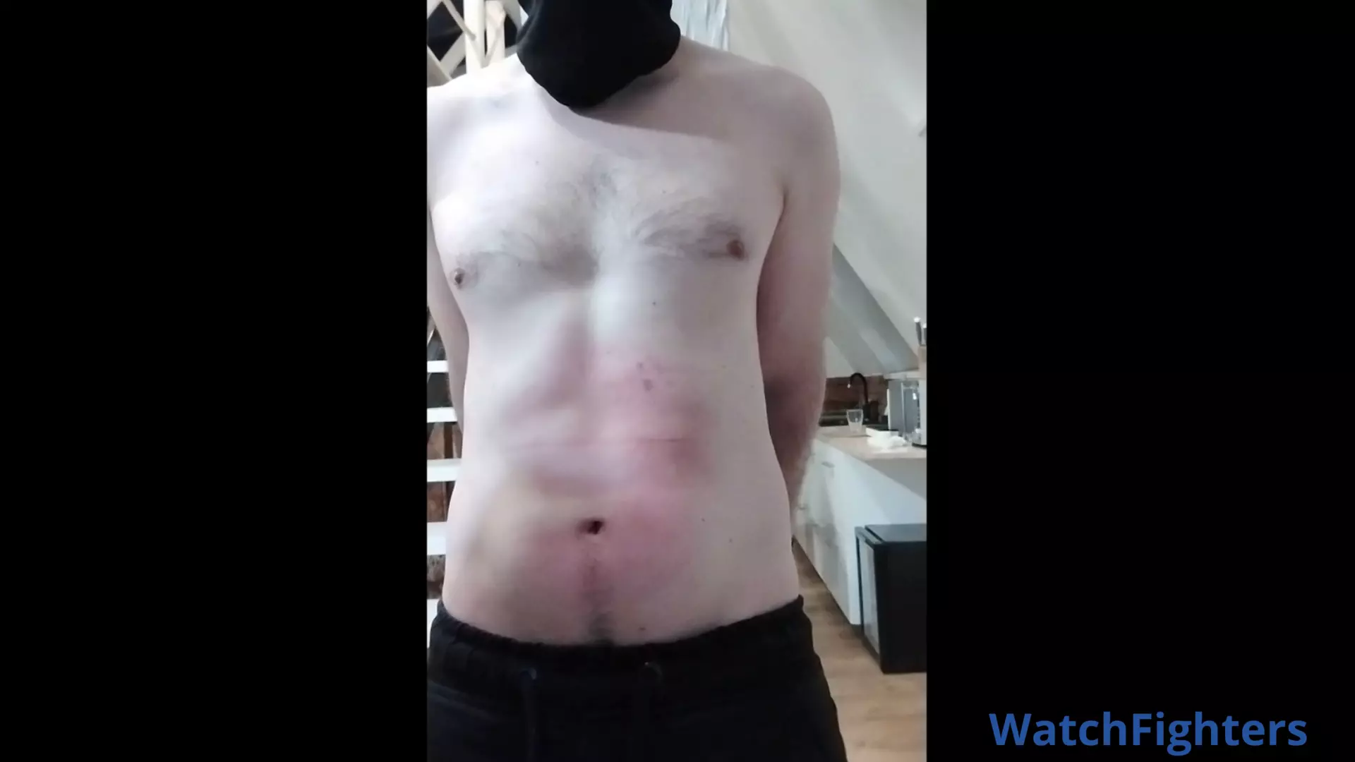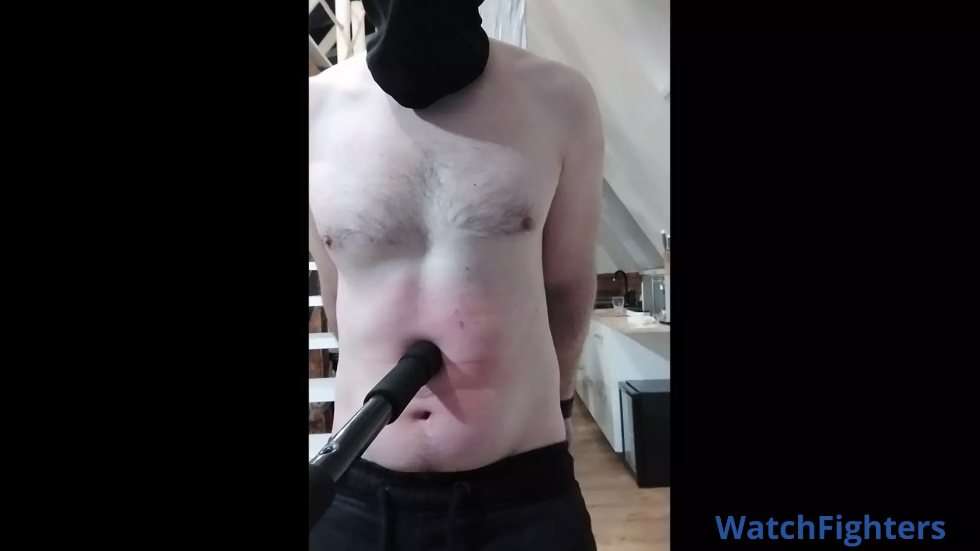 Heavy beating at already swollen abs. The victim is tied to the pillar and being punched by another guy with bare fists and metal stick. Hard blows fall on the red trembling abs being at the end of its endurance. Each punch penetrate them digging deeper and deeper, delivering the punching bag great amounts of pain! The victim also has to endure hard nipple play and belly poking with a metal stick.