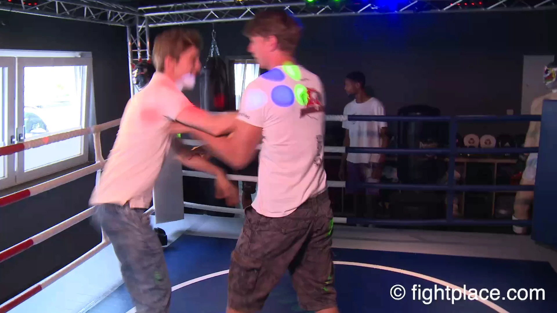 Moe refuses to back down and keeps tearing at Mika’s clothes. Soon both are stripped down to their underwear. When Moe needs a break, Jamie steps in, but Marik pushes forward and challenges him instead. As is often the case with newcomers, Marik shows spirit but lacks the conditioning and experience to last long against the seasoned Fightplace fighters.