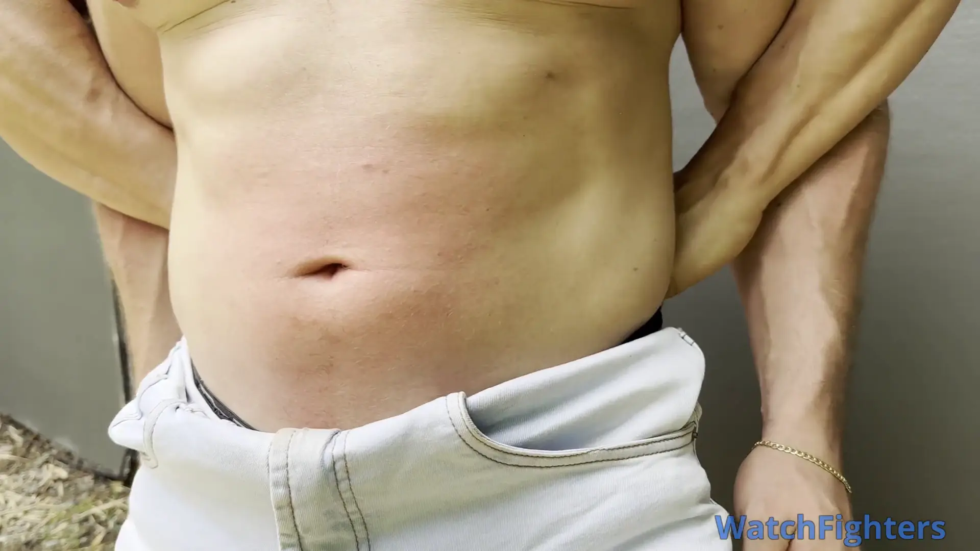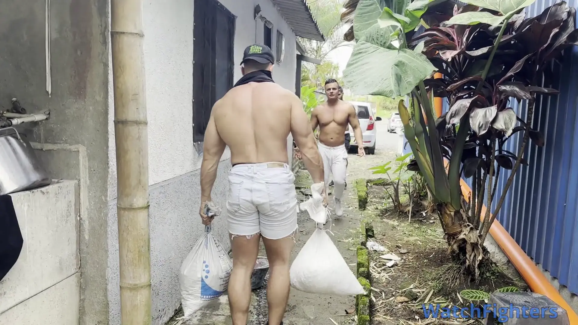 English: Two construction workers demand that Steve Cass do their work for them while they relax. When Steve refuses to do it, one of the men grabs his arms and the other teaches him a lesson by punching his abs until he is on his knees gasping for air. Later, the two men return to see if Steve has done their work. When they see that he did not do it, they sucker punch him in the gut and give him another beating in the stomach.