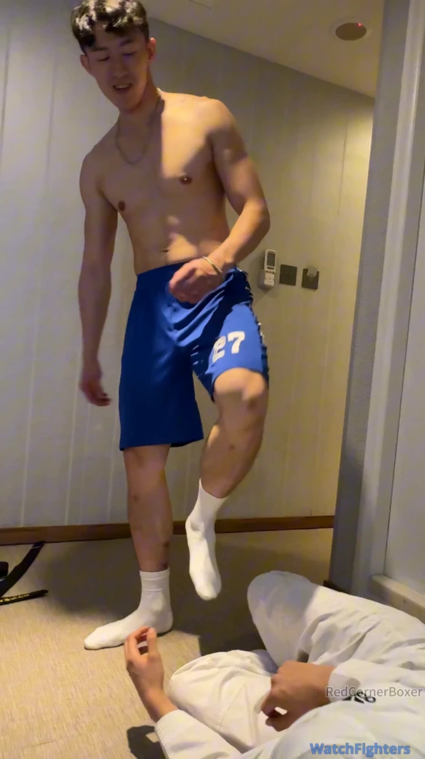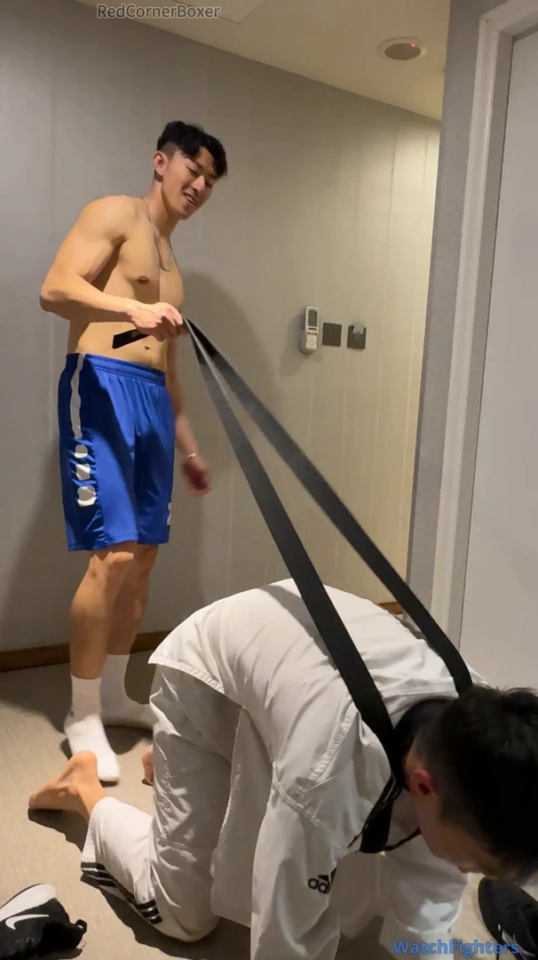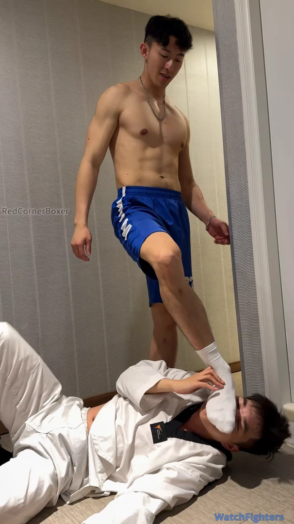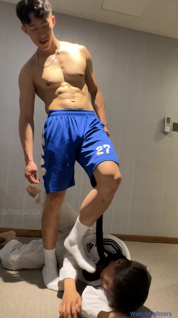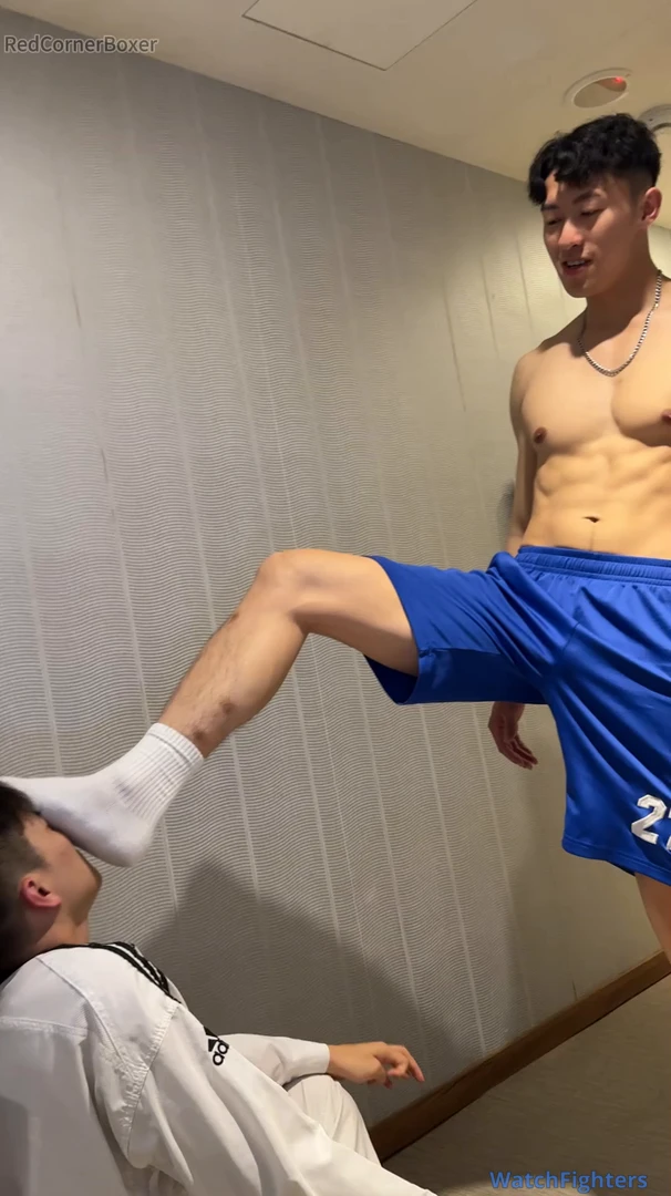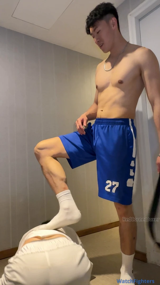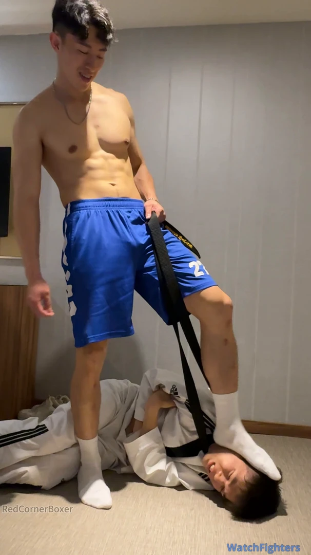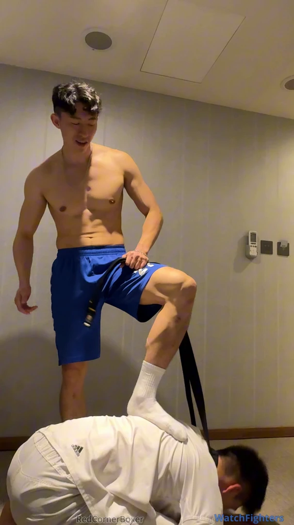 This is yet another great video featuring Captain. He’s dominant as usual with his signature cocky smile , this time using the belt either as a leash on his poor subject or as a whip. Either way, it helps Captain to assert dominance on the poor TKDBag who is forced to obey Captain’s orders or risks being punished. Captain surely knows how to keep TKDBag in place - commanding him to kneel, bark and smell his feet. Captain also orders TKDBag to spread his legs for some ball punishment to remind him who is the master. Poor TKDBag suffers so much humiliation in this video but it’s so sexy to see Captain being so dominant. I just wished I understand what Captain was saying! Please make more videos featuring Captain (or Champion - my 2nd favourite actor from Redcornerboxer)!