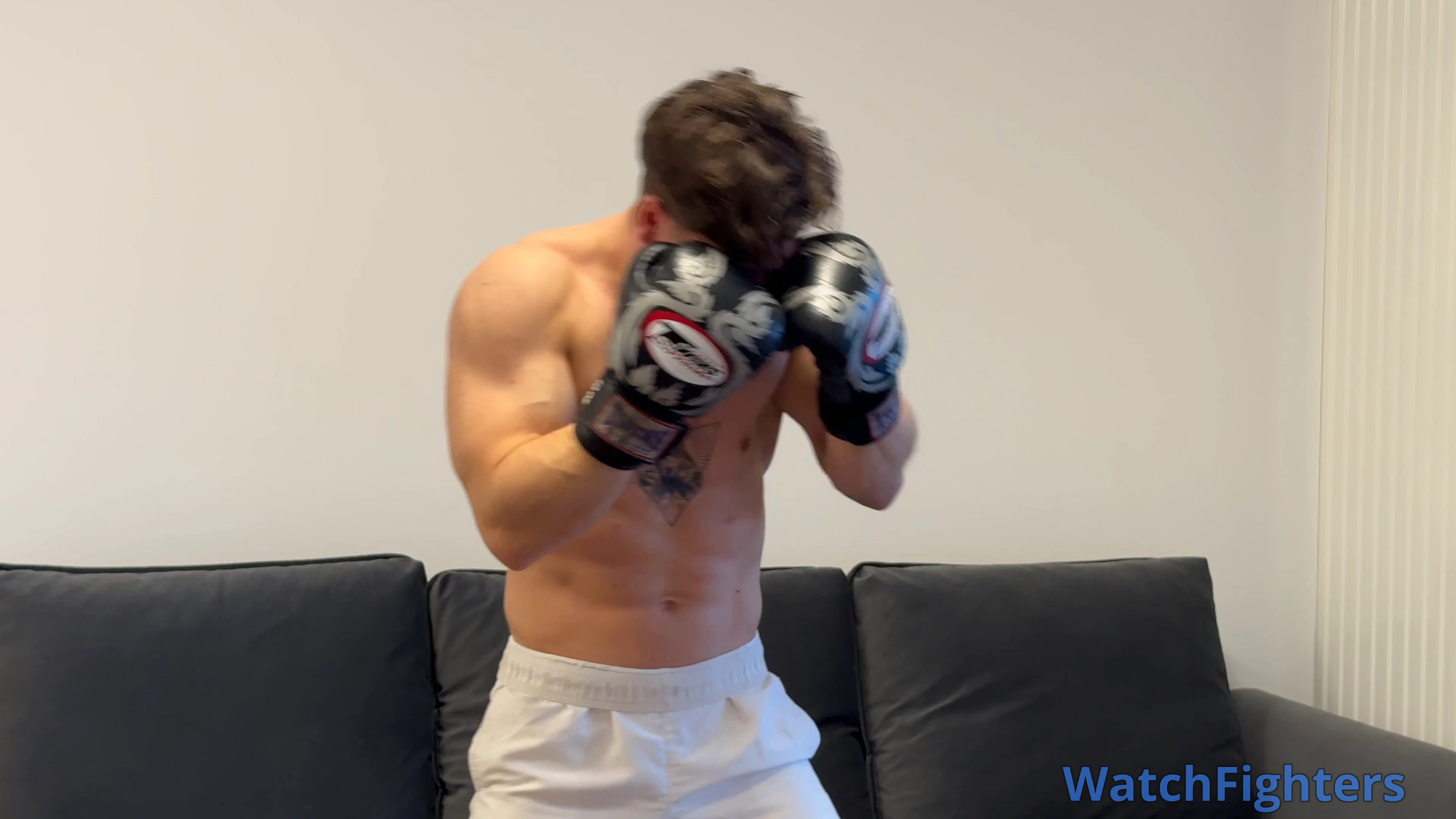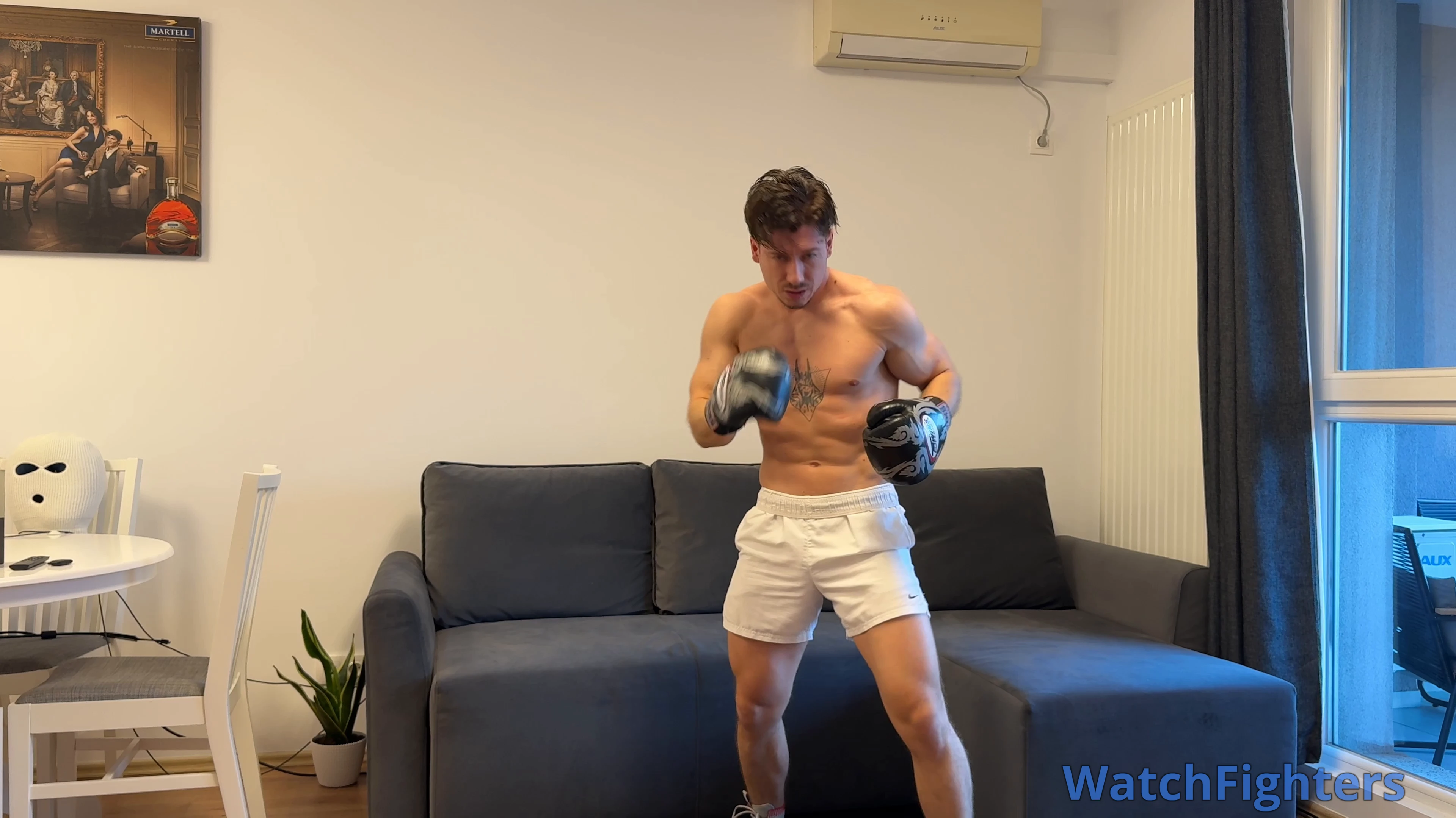 You step into the ring across from your opponent as the bell rings. From the opening moments, you set the pace. You pressure forward, breaking through his defense with steady body shots and sharp hooks upstairs. Each punch takes more out of him—his abs tighten, his posture folds, his head snaps with every clean hook. Round by round, you can see the fatigue building.