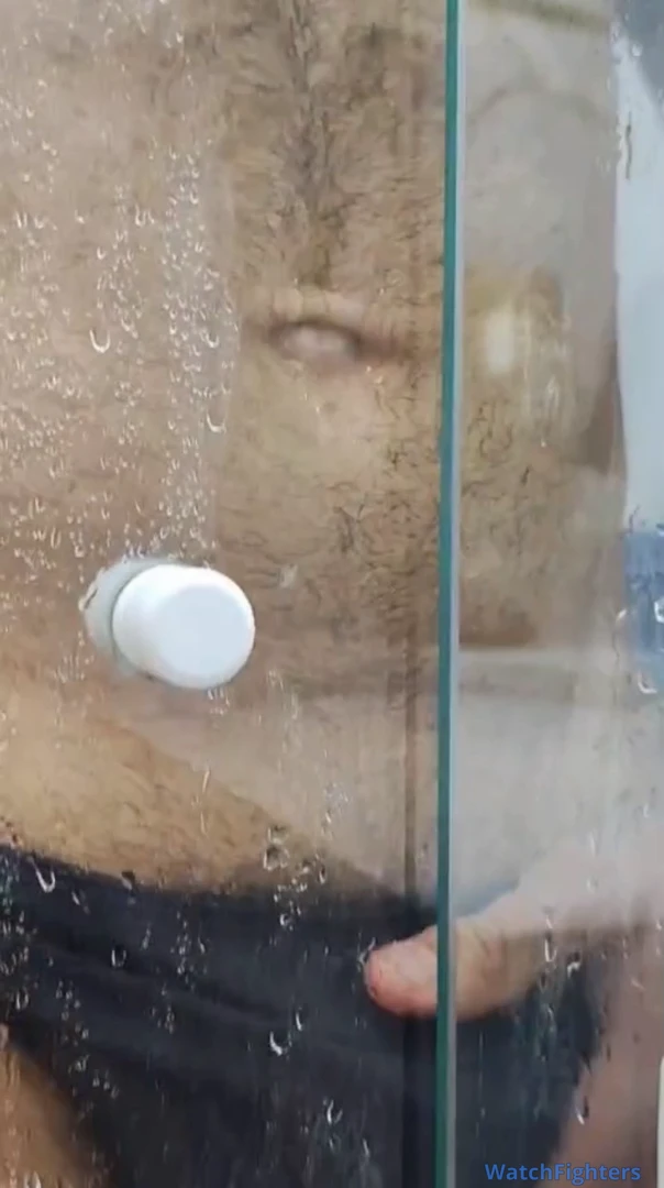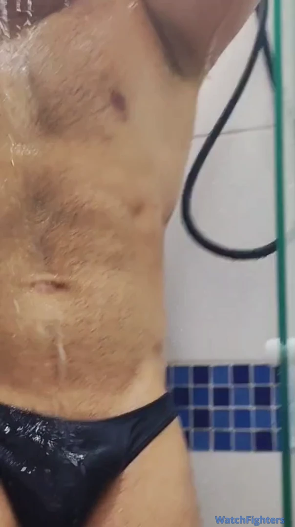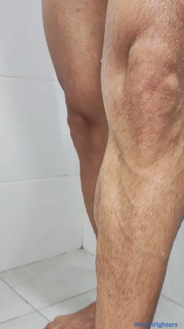Macho exibindo seus quadríceps gigantes no banho