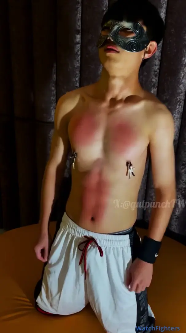 He was made to kneel, showing off his abs,as they stomped and punched his already abused abs.