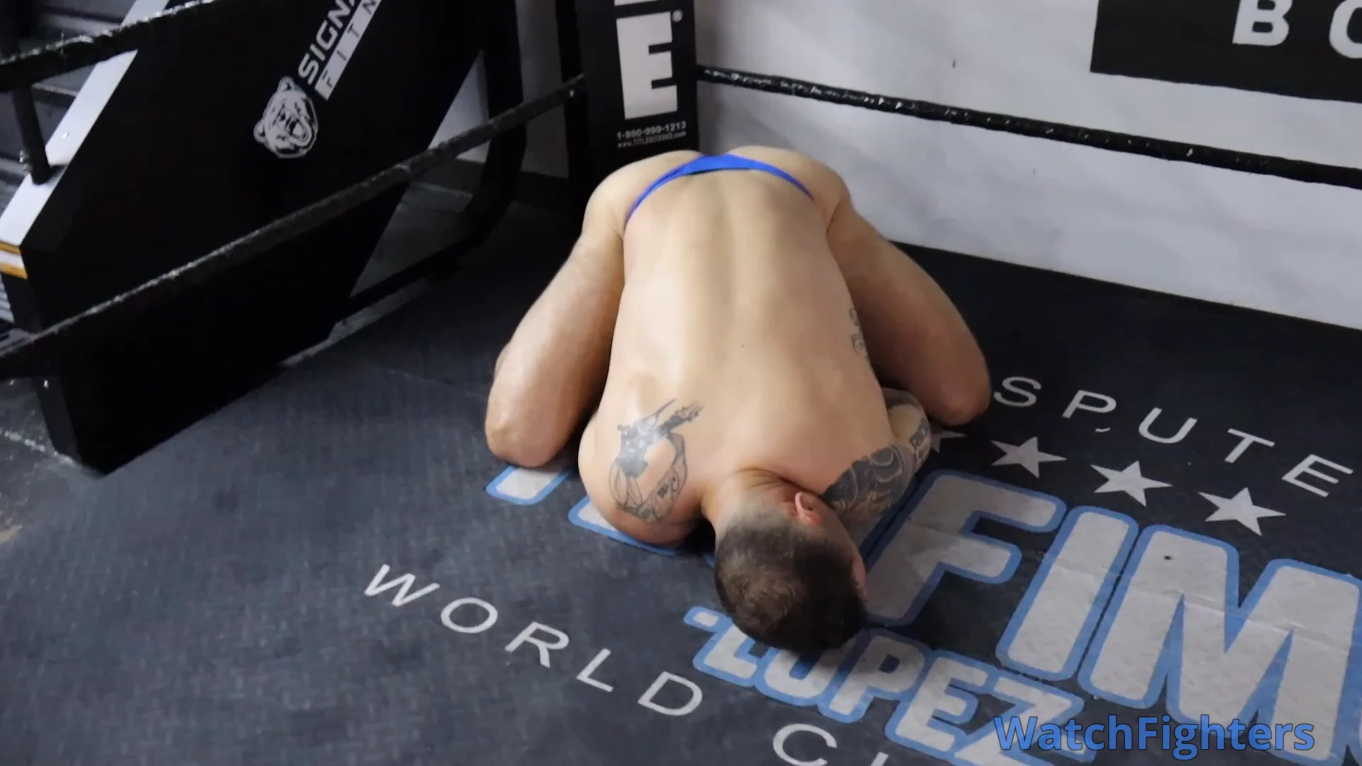 It's a battle of the Blaynes (Blains?) as the two wrestlers meet up in the ring. Blayne in a green thong and Blain in a blue one. Blayne's been wanting to test his knuckles out, and the gutpunches start. He relentlessly attacks his opponent with gutpunches and ab rakes as Blain begs for it to stop. He thoughtfully allows Blain brief moments to catch his breath before adding chokeholds and kicks to his assault. A gutbuster or two leaves Blain broken over Blayne's knee and the match seems to be over relatively quickly.
