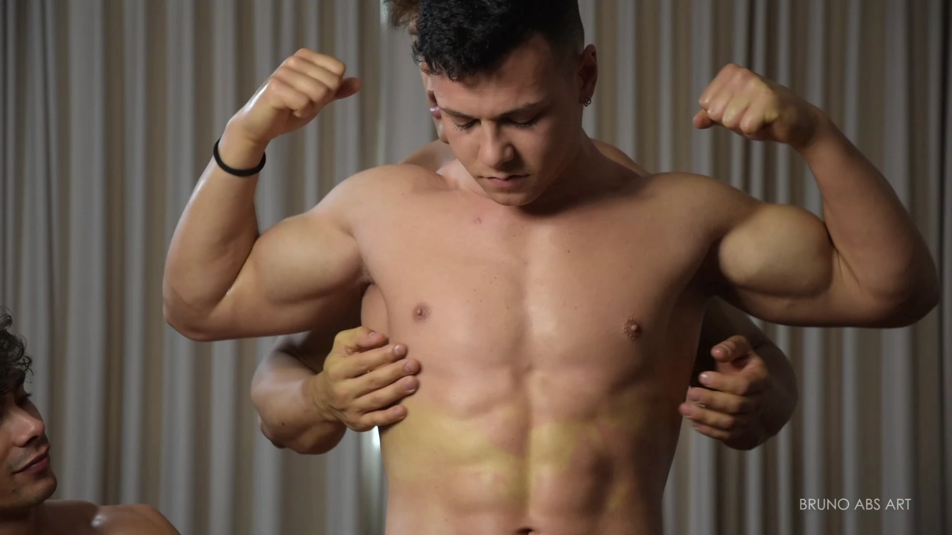 The designer and his models blur the line between fashion and fantasy, turning fittings into contests of strength and admiration. Laughter, energy, and muscular confidence take over as they enjoy their own backstage world—where the spotlight is on bodies, power, and the joy of playful competition