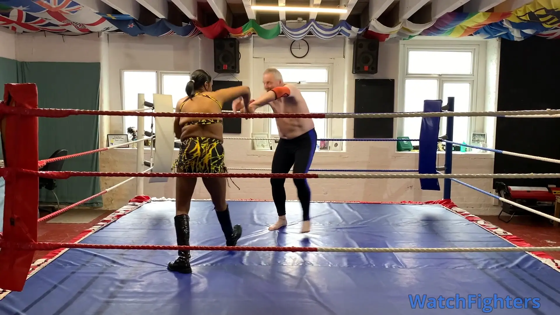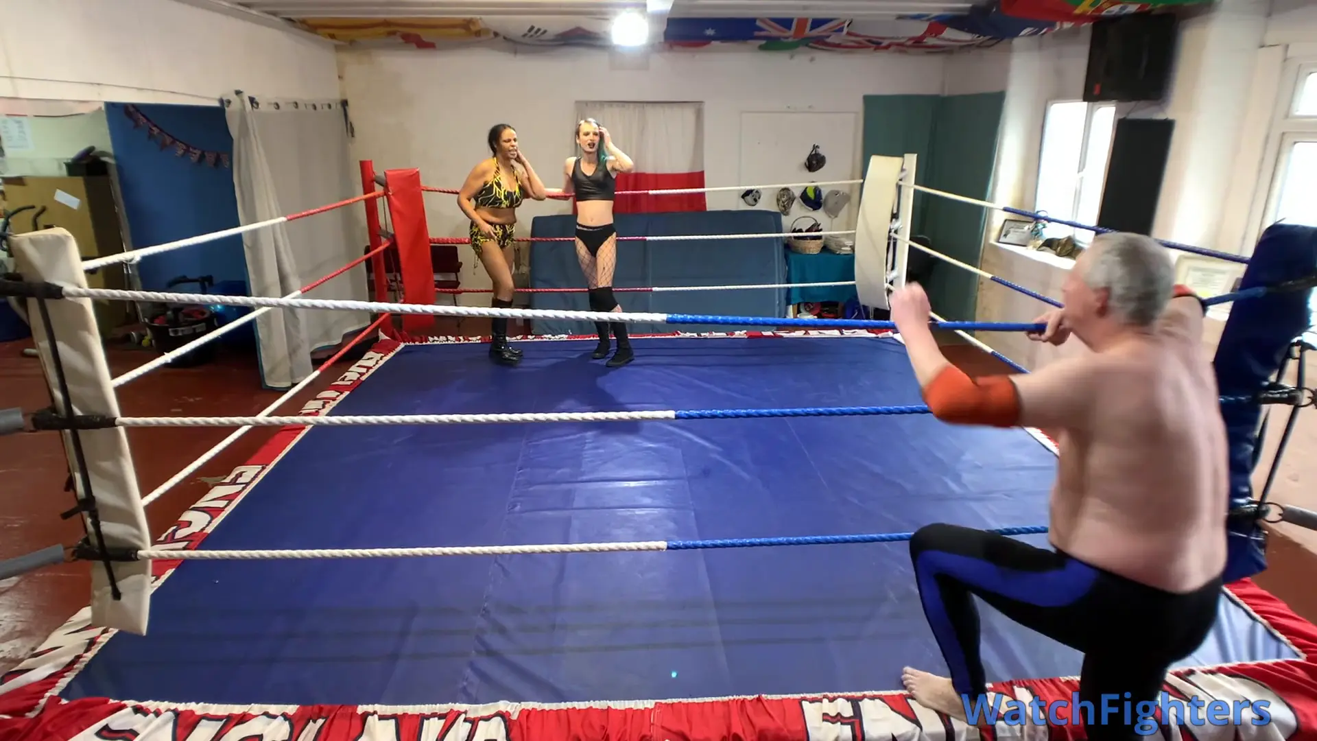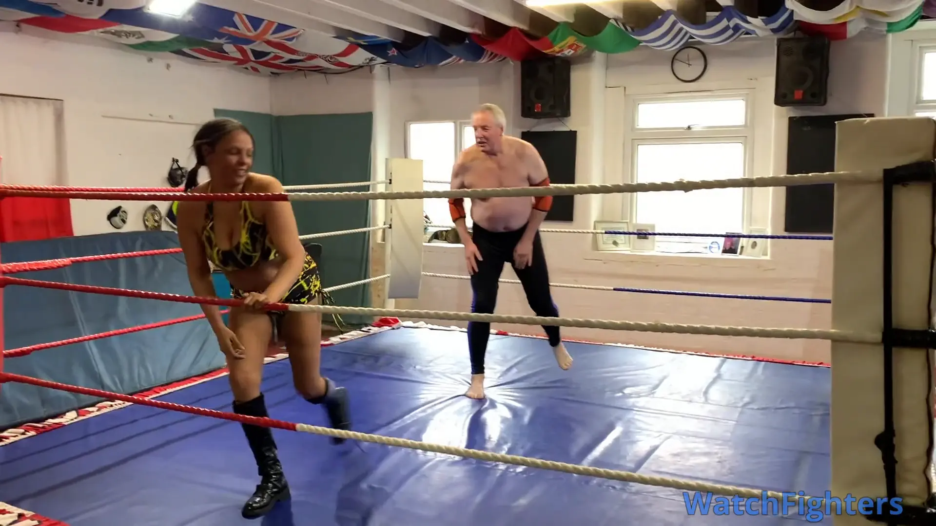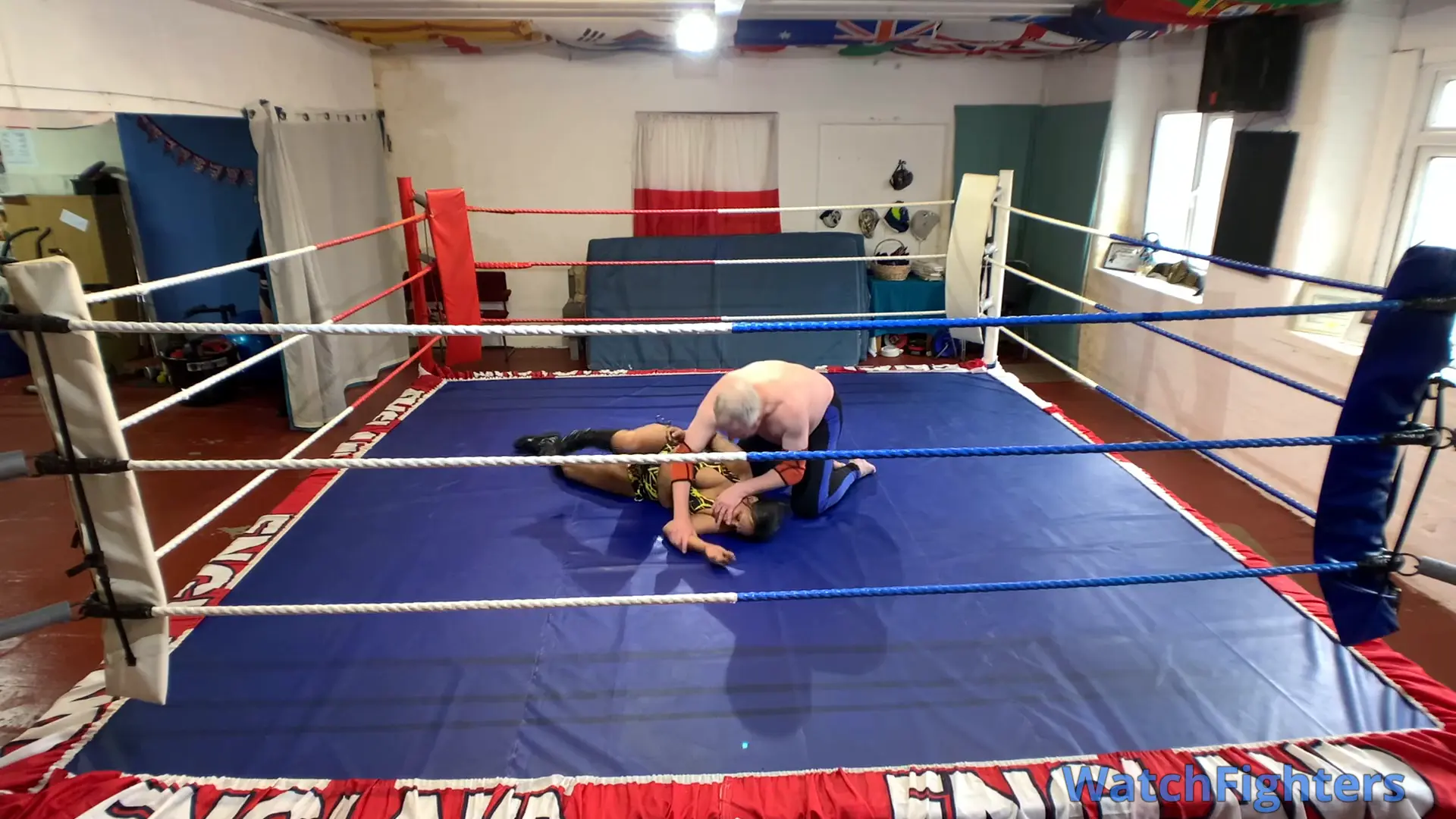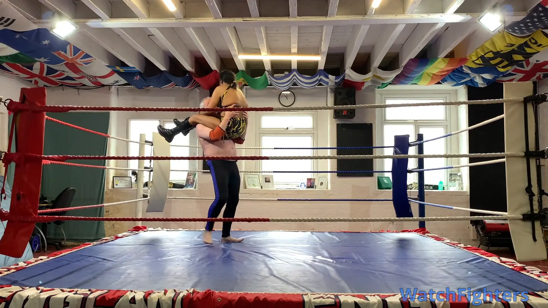 Action from a pro style mixed wrestling match featuring dominatrix & female session wrestler, MD Storm v Stephen held at TWF Manchester.