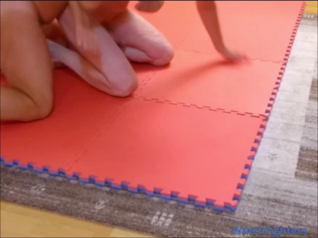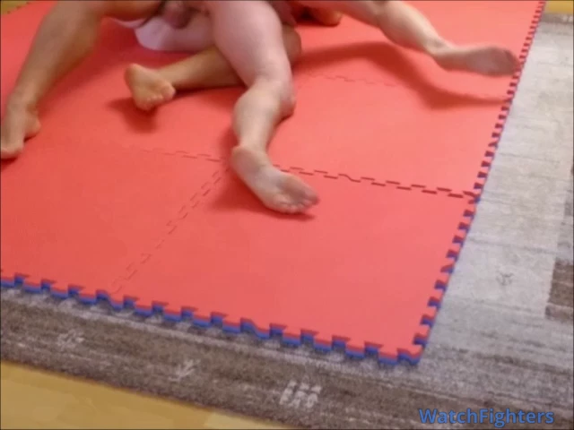 He throws me onto the mat and goes for my penis and testicles. I had to give up, and we start a new round. Again, he pushes me down and lies on top of me. But suddenly, I manage to break free and turn him onto his back. I sit on him, but he shakes me off and grabs me from behind. He wins the point again. Without a break, it continues, with him attacking again. Finally, he sits on me, presses his large testicles against my face, and grabs my penis. I can't break free and have to give up.