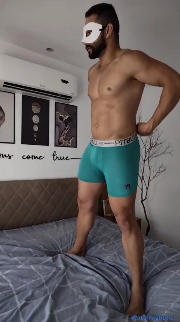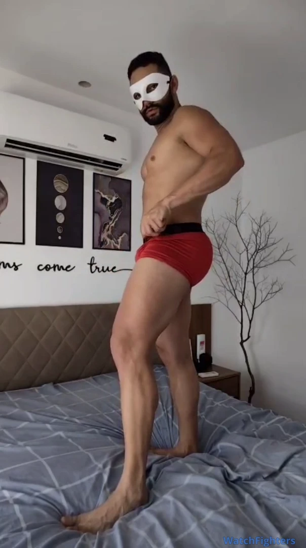 Macho musculoso exibindo suas novas cuecas para saber qual fica melhor em seus grandes quadríceps