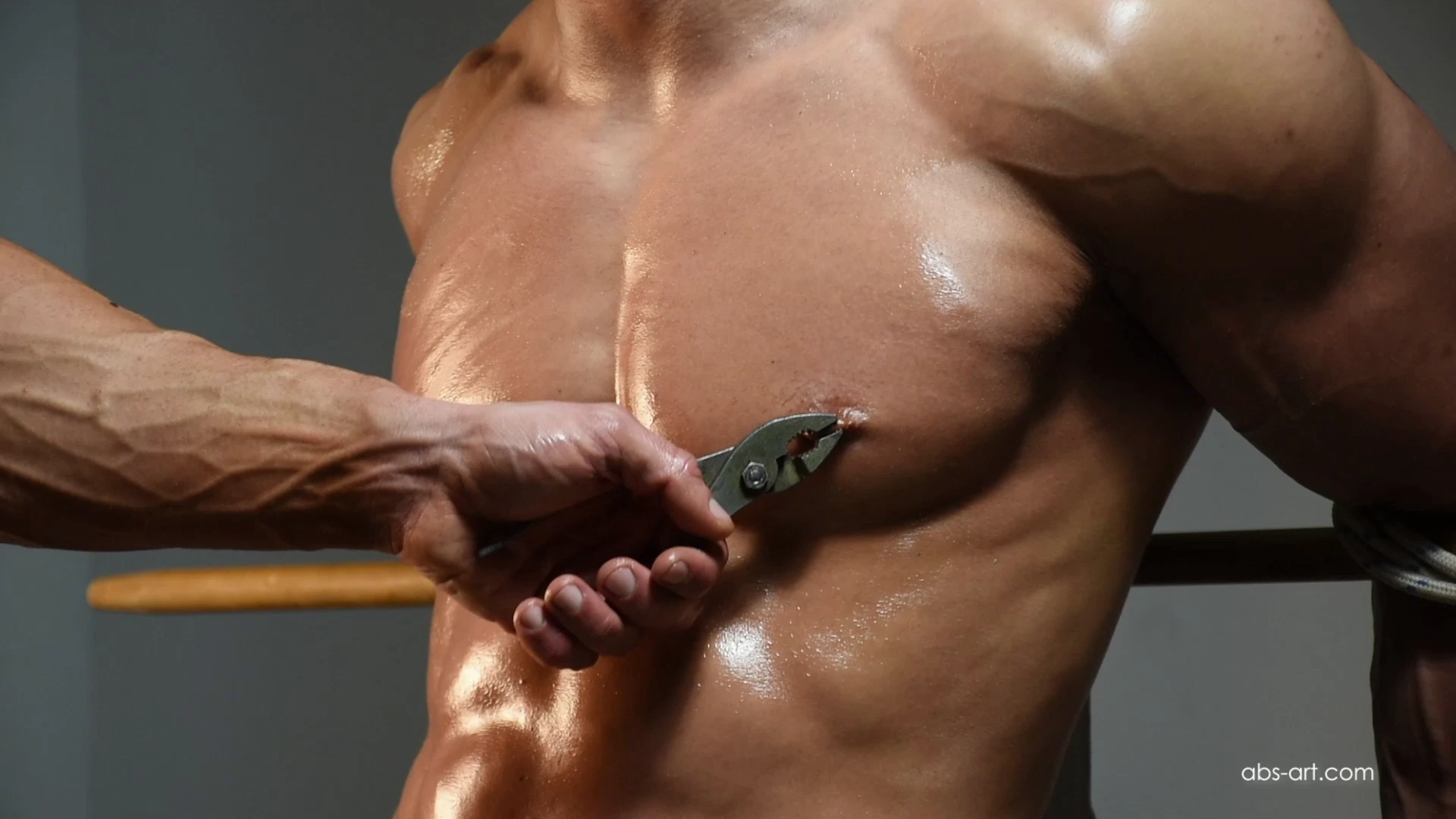 Ripped Hugo tied up painful nipple punishment and electro