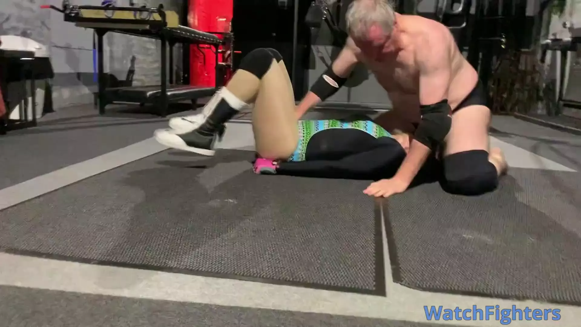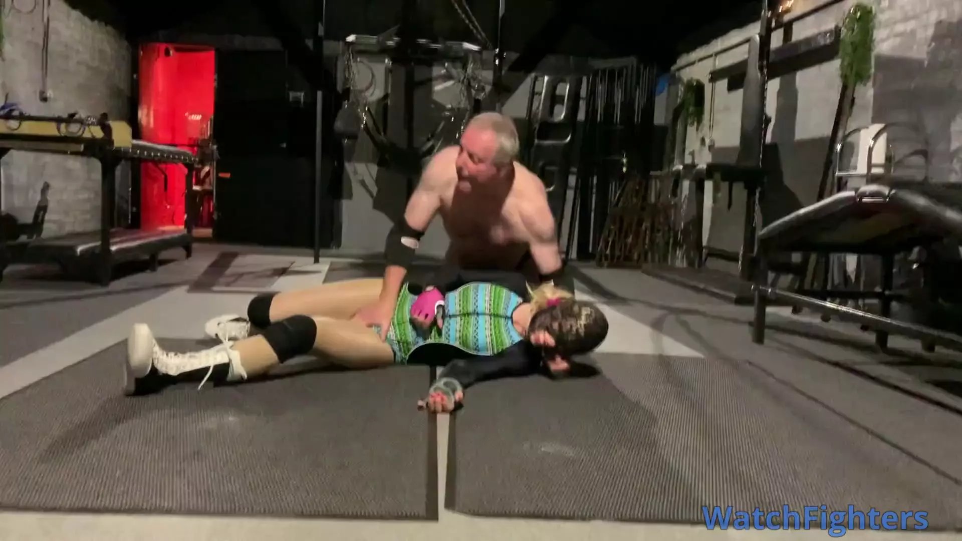 Action from a pro style mixed wrestling match featuring trans female Nina Jay v Stephen held in a dungeon room at The Facility, Walsall.