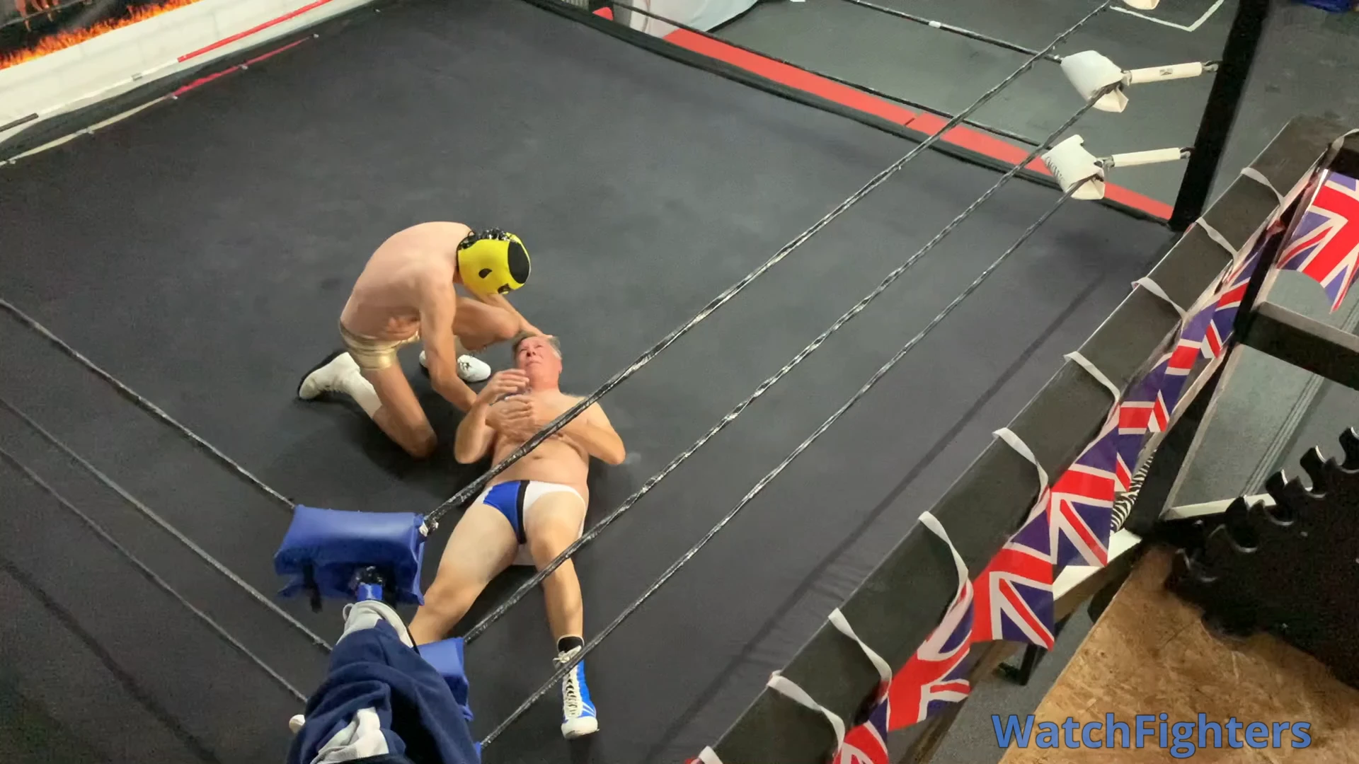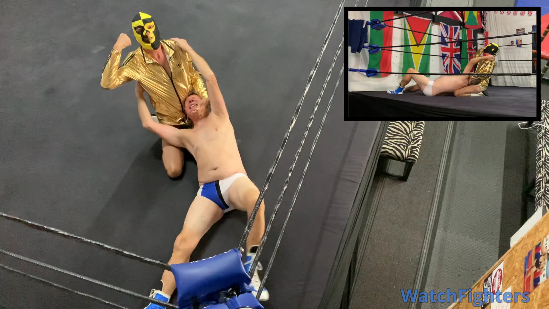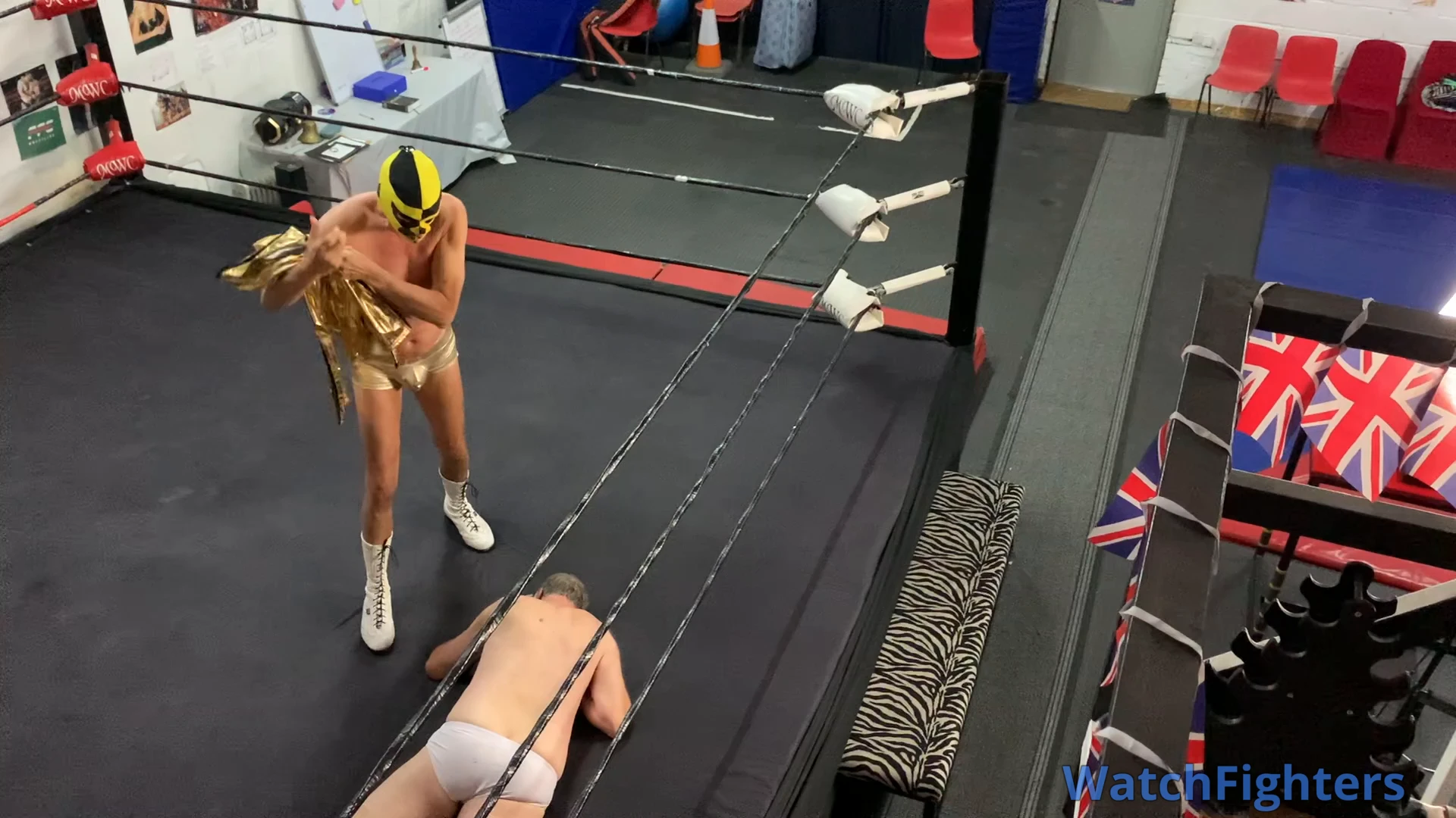 Action from a pro style wrestling match featuring the hooded menace, Sparkle v Chris Nelson London.
