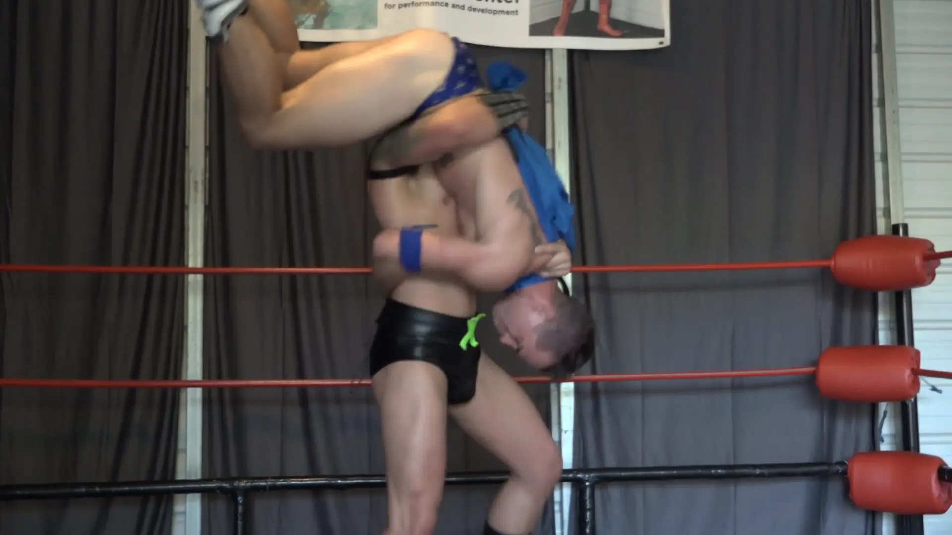 During one of the times he has frozen the American Missile in time Green Fang strips his of his star spangled speedo down to just a patriotic g-string. Virtually naked, the American Missile is strangled, nearly knocked unconscious from a powerful sleeper hold, and force fed his blue star spangled speedo, all for Green Fang's pleasure...and yours.