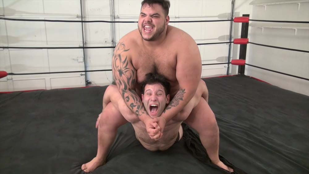 Massive shirtless fatass Mountain is airing out his nasty feet proclaiming himself to be the unbeatable big guy, when who should walk in but daddy’s boy Damien Rush, strutting his muscles all about, completely oblivious of the mammoth size of his soon to be opponent. Mountain doubles the size of Damien who is a pretty big boy himself. As the two face off the contrast is clear, a shredded healthy looking Rush is attempting to topple the obese monster that no man can fell. Snatched in a Bear hug Mountain squeezes and crushes the spine of the privileged boy. “Beg for mercy pussy!” Mountain is never at a loss for trash talking pretty boys. He loves getting his gelatinous hands all over that alpha male muscle and smashing it to smithereens alongside the big bodybuilder egos.