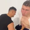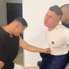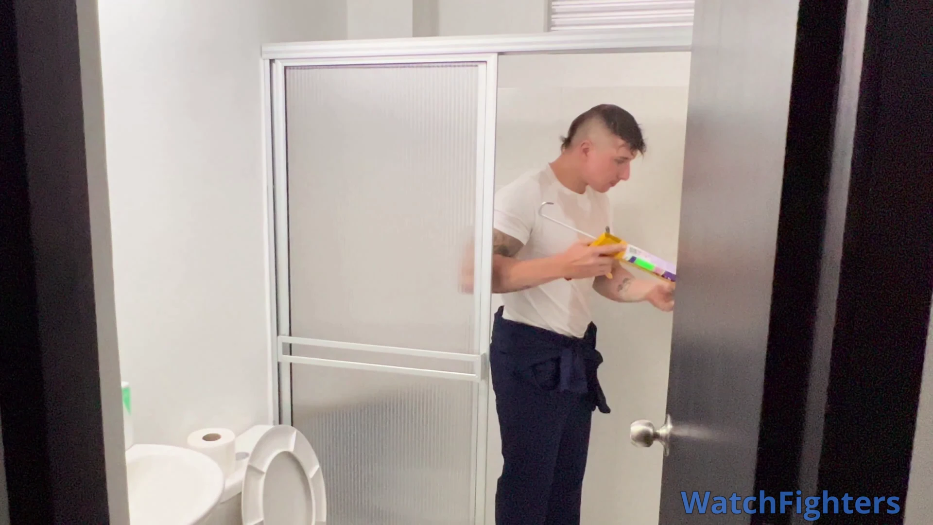 Plumber Danniel Ospina is not doing a great job. While getting completely drenched working on a shower, the owner makes him stop. Danniel is pushed into the owner's friend who grabs his arms and the owner works over his abdomen through a wet and see-through shirt.