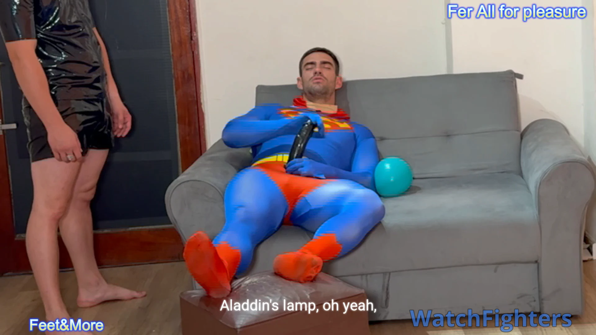 The villain takes a dildo to play with Superman, moaning and get so fun with him. Superman in a roleplay way is knock out, always awake enjoying the dildo, starting to get horny touching the dildo.